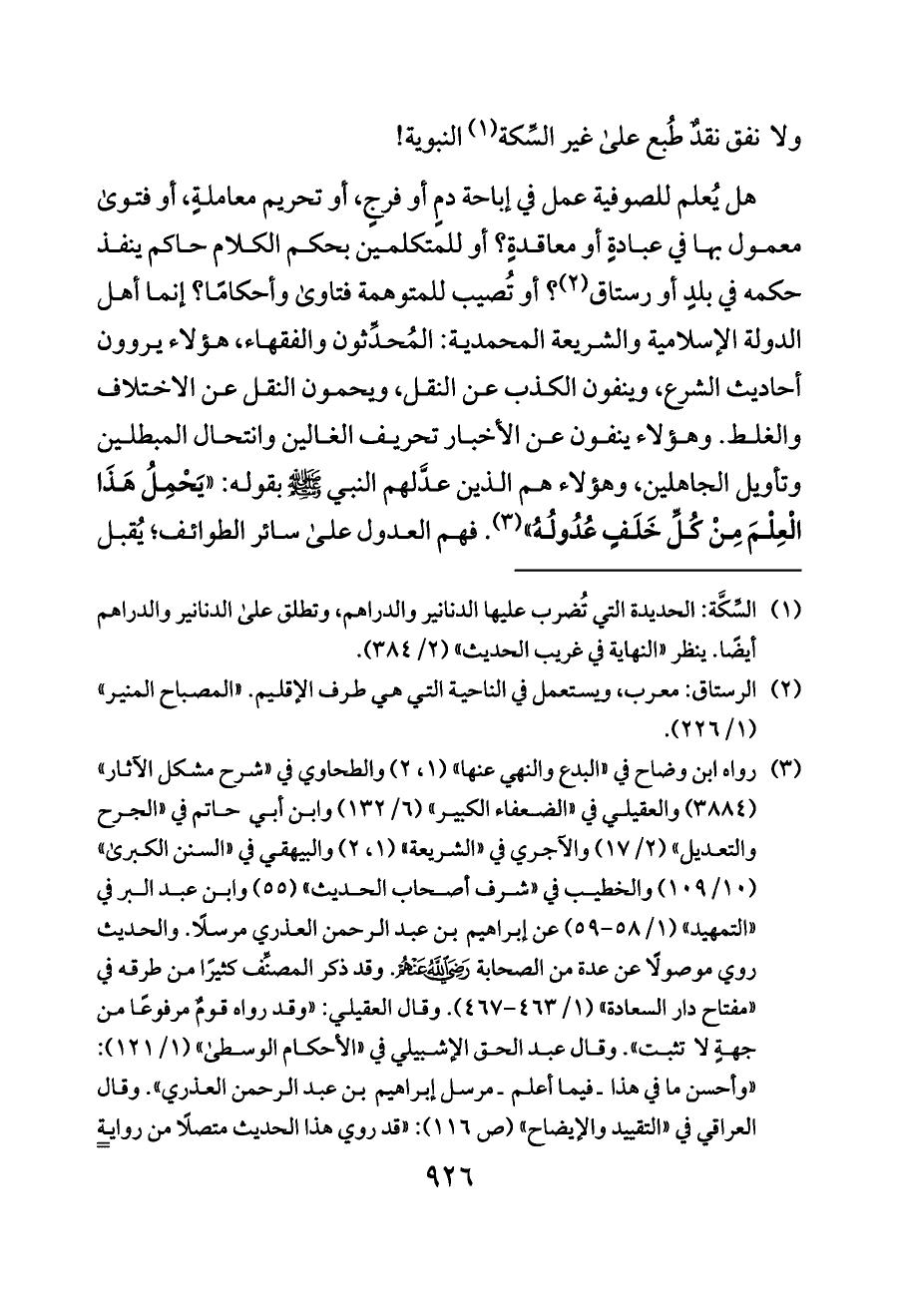 هل يُعلم للصوفية عمل في إباحة دمٍ أو فرجٍ، أو تحريم معاملةٍ، أو فتوى معمول بها في عبادةٍ أو معاقدةٍ؟ أو للمتكلمين بحكم الكلام حاكم ينفذ حكمه في بلدٍ أو رستاق (¬٢)؟ أو تُصيب للمتوهمة فتاوى وأحكامًا؟ إنما أهل الدولة الإسلامية والشريعة المحمدية: المُحدِّثون والفقهاء، هؤلاء يروون أحاديث الشرع، وينفون الكذب عن النقل، ويحمون النقل عن الاختلاف والغلط. وهؤلاء ينفون عن الأخبار تحريف الغالين وانتحال المبطلين وتأويل الجاهلين، وهؤلاء هم الذين عدَّلهم النبي - صلى الله عليه وسلم - بقوله: «يَحْمِلُ هَذَا الْعِلْمَ مِنْ كُلِّ خَلَفٍ عُدُولُهُ» (¬٣).