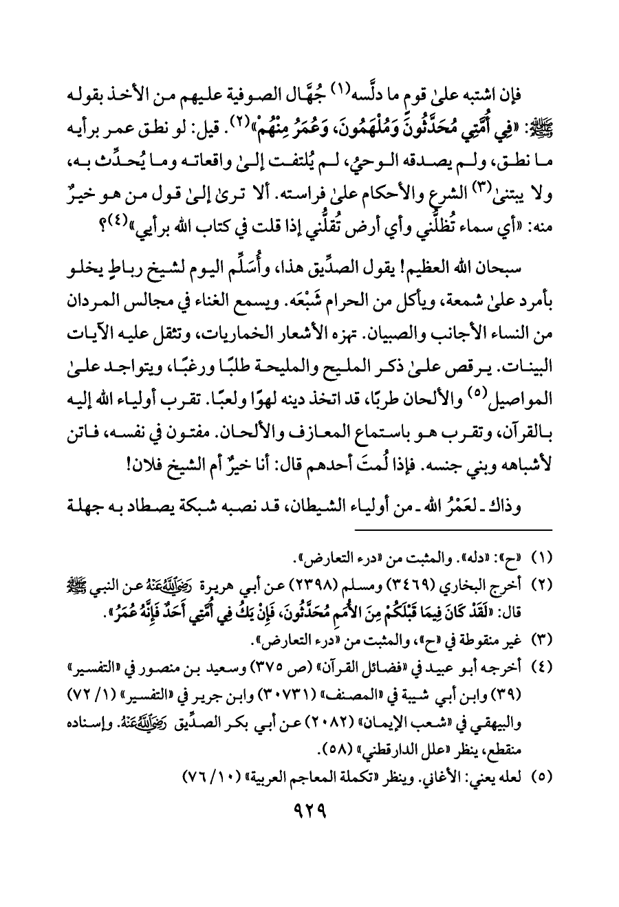 فإن اشتبه على قومٍ ما دلَّسه (¬١) جُهَّال الصوفية عليهم من الأخذ بقوله - صلى الله عليه وسلم -: «فِي أُمَّتِي مُحَدَّثُونَ وَمُلْهَمُونَ، وَعُمَرُ مِنْهُمْ» (¬٢). قيل: لو نطق عمر برأيه ما نطق، ولم يصدقه الوحيُ، لم يُلتفت إلى واقعاته وما يُحدِّث به، ولا يبتنى (¬٣) الشرع والأحكام على فراسته. ألا ترى إلى قول من هو خيرٌ منه: «أي سماء تُظلُّني وأي أرض تُقلُّني إذا قلت في كتاب الله برأيي» (¬٤)؟