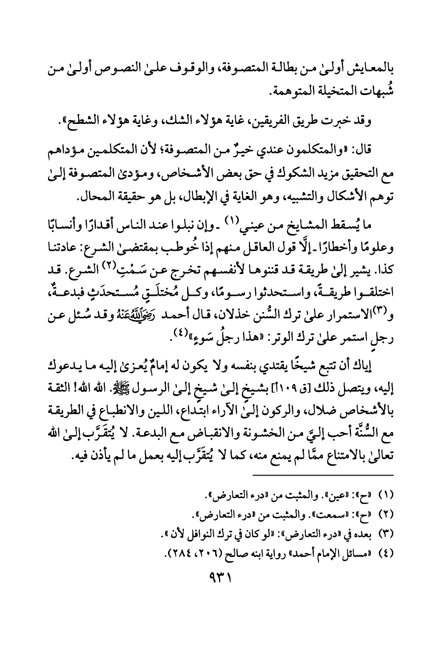 بالمعايش أولى من بطالة المتصوفة، والوقوف على النصوص أولى من شُبهات المتخيلة المتوهمة.