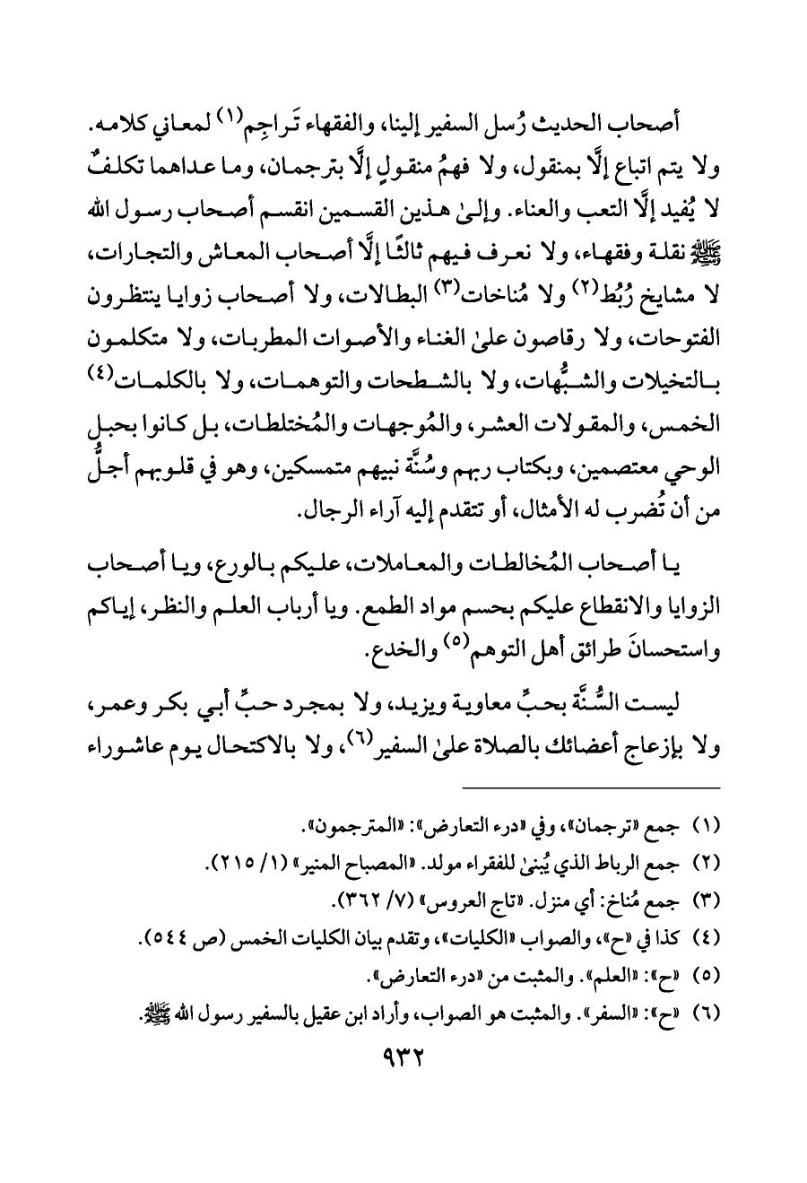 أصحاب الحديث رُسل السفير إلينا، والفقهاء تَراجِم (¬١) لمعاني كلامه. ولا يتم اتباع إلَّا بمنقول، ولا فهمُ منقولٍ إلَّا بترجمان، وما عداهما تكلفٌ لا يُفيد إلَّا التعب والعناء. وإلى هذين القسمين انقسم أصحاب رسول الله - صلى الله عليه وسلم - نقلة وفقهاء، ولا نعرف فيهم ثالثًا إلَّا أصحاب المعاش والتجارات، لا مشايخ رُبُط (¬٢) ولا مُناخات (¬٣) البطالات، ولا أصحاب زوايا ينتظرون الفتوحات، ولا رقاصون على الغناء والأصوات المطربات، ولا متكلمون بالتخيلات والشبُّهات، ولا بالشطحات والتوهمات، ولا بالكلمات (¬٤) الخمس، والمقولات العشر، والمُوجهات والمُختلطات، بل كانوا بحبل الوحي معتصمين، وبكتاب ربهم وسُنَّة نبيهم متمسكين، وهو في قلوبهم أجلُّ من أن تُضرب له الأمثال، أو تتقدم إليه آراء الرجال.