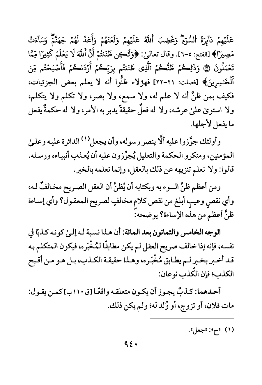 عَلَيْهِمْ دَائِرَةُ اُلسُّوءِ وَغَضِبَ اَللَّهُ عَلَيْهِمْ وَلَعَنَهُمْ وَأَعَدَّ لَهُمْ جَهَنَّمَ وَسَاءَتْ مَصِيرًا} [الفتح: ٥ - ٦]. وقال تعالى: {وَلَكِن ظَنَنتُمْ أَنَّ اَللَّهَ لَا يَعْلَمُ كَثِيرًا مِّمَّا تَعْمَلُونَ (٢١) وَذَلِكُمْ ظَنُّكُمُ اُلَّذِي ظَنَنتُم بِرَبِّكُمْ أَرْدَاكُمْ فَأَصْبَحْتُم مِّنَ اَلْخَاسِرِينَ} [فصلت: ٢١ - ٢٢] فهؤلاء ظنُّوا أنه لا يعلم بعض الجزئيات، فكيف بمن ظنَّ أنه لا علم له، ولا سمع، ولا بصر، ولا تكلم ولا يتكلم، ولا استوى على عرشه، ولا له فعلٌ حقيقةً يدبر به الأمر، ولا له حكمةٌ يفعل ما يفعل لأجلها.