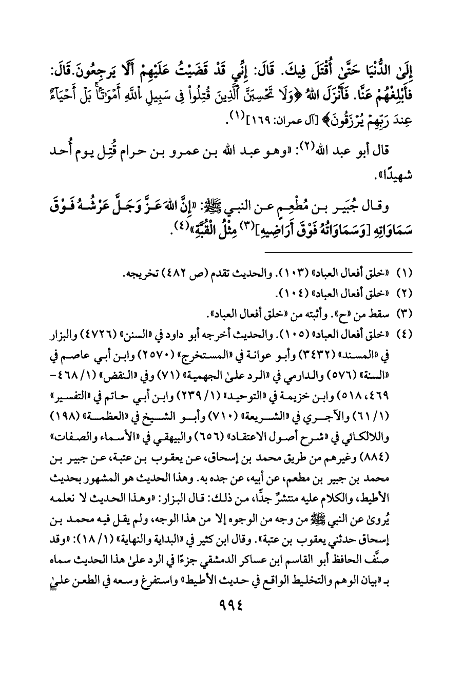 (¬٤) «خلق أفعال العباد» (١٠٥). والحديث أخرجه أبو داود في «السنن» (٤٧٢٦) والبزار في «المسند» (٣٤٣٢) وأبو عوانة في «المستخرج» (٢٥٧٠) وابن أبي عاصم في «السنة» (٥٧٦) والدارمي في «الرد على الجهمية» (٧١) وفي «النقض» (١/ ٤٦٨ - ٤٦٩، ٥١٨) وابن خزيمة في «التوحيد» (١/ ٢٣٩) وابن أبي حاتم في «التفسير» (١/ ٦١) والآجري في «الشريعة» (٧١٠) وأبو الشيخ في «العظمة» (١٩٨) واللالكائي في «شرح أصول الاعتقاد» (٦٥٦) والبيهقي في «الأسماء والصفات» (٨٨٤) وغيرهم من طريق محمد بن إسحاق، عن يعقوب بن عتبة، عن جبير بن محمد بن جبير بن مطعم، عن أبيه، عن جده به. وهذا الحديث هو المشهور بحديث الأطيط، والكلام عليه منتشرٌ جدًّا، من ذلك: قال البزار: «وهذا الحديث لا نعلمه يُروى عن النبي - صلى الله عليه وسلم - من وجه من الوجوه إلا من هذا الوجه، ولم يقل فيه محمد بن إسحاق حدثني يعقوب بن عتبة». وقال ابن كثير في «البداية والنهاية» (١/ ١٨): «وقد صنَّف الحافظ أبو القاسم ابن عساكر الدمشقي جزءًا في الرد على هذا الحديث سماه بـ «بيان الوهم والتخليط الواقع في حديث الأطيط» واستفرغ وسعه في الطعن على محمد بن إسحاق بن يسار راويه، وذكر كلام الناس فيه». وقال الذهبي في «العلو» (ص ٤٤ - ٤٥): «هذا حديث غريبٌ جدًّا فردٌ، وابن إسحاق حجة في المغازي إذا أسند، وله مناكير وعجائب». وقد صحَّحه المصنِّف في «تهذيب السنن» (٧/ ٩٥ - ١١٧) وردَّ على من أعله.