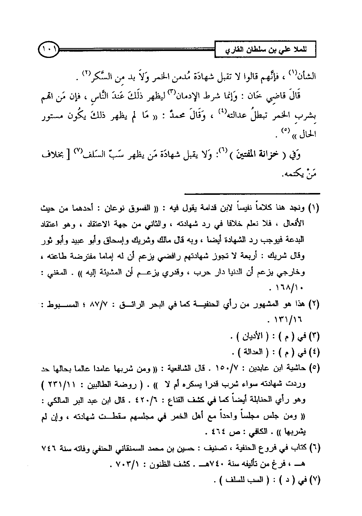 (¬5) حاشية ابن عابدين: 7/ 150. قال الشافعية: ((ومن شربها عامدا عالما بحالها حد وردت شهادته سواء شرب قدرا يسكره أم لا)). (روضة الطالبين: 11/ 231) وهو رأي الحنابلة أيضاً كما في كشف القناع: 6/ 420. قال ابن عبد البر المالكي: ((ومن جلس مجلساً واحداً مع أهل الخمر في مجلسهم سقطت شهادته وإن لم يشربها)). الكافي: ص 464.