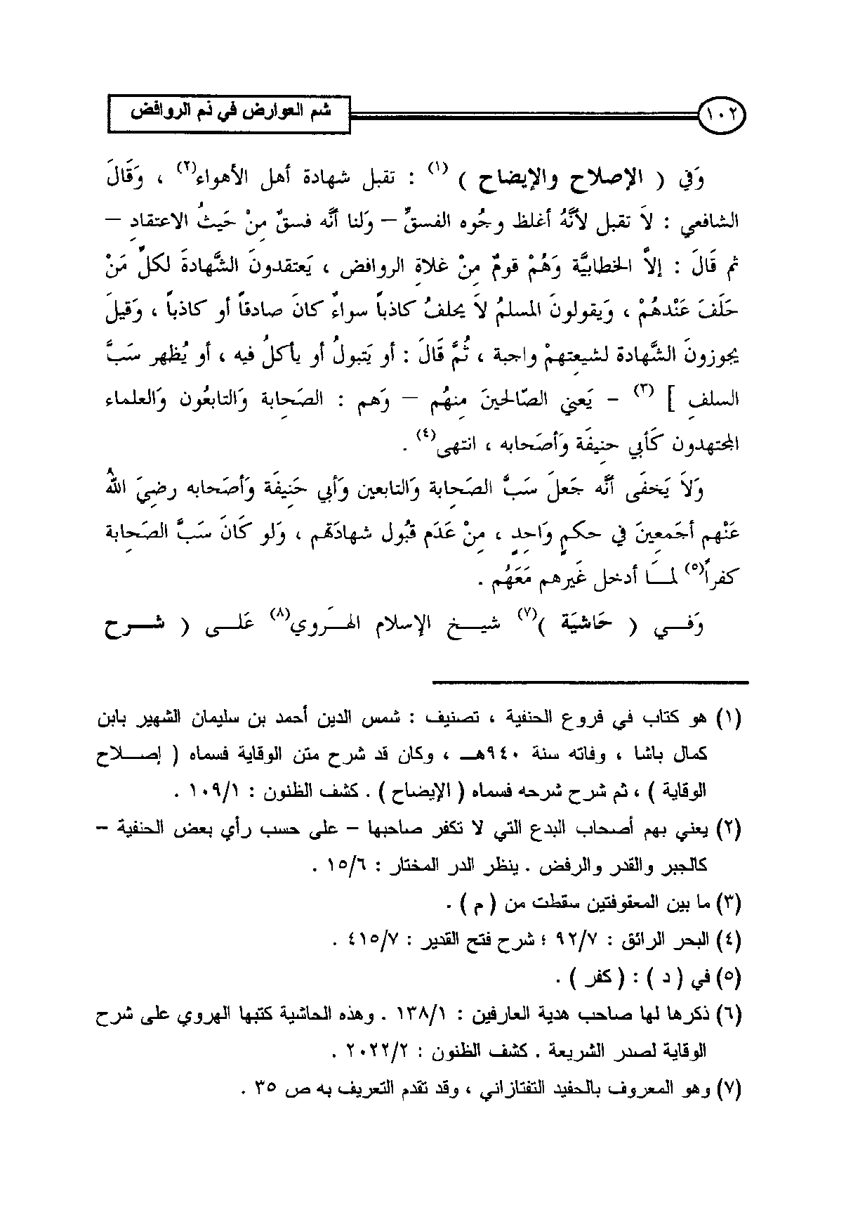 وَلاَ يَخفَى أنه جَعلَ سَبَّ الصَحِابة وَالتابعين وَأبي حَنِيفَة وَأصَحابه رضي الله عنهم أجَمعِينَ في حكمٍ وَاحِد، مِن عَدَم قبُول شهادَتهم، وَلو كَانَ سَبَّ الصَحِابة كفراً (¬5) لمَا أدخل غَيرهم مَعَهُم.