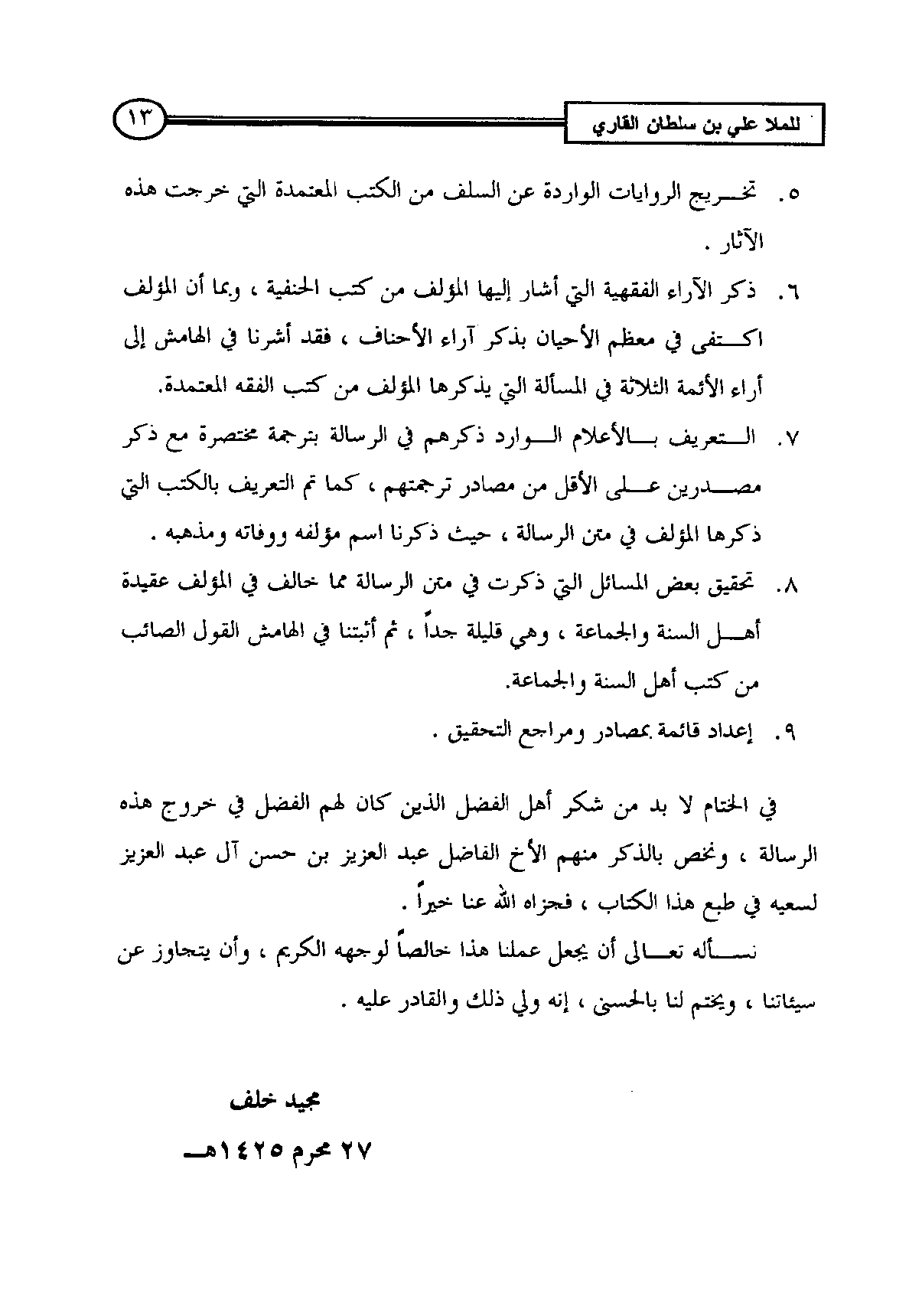 8. تحقيق بعض المسائل التي ذكرت في متن الرسالة مما خالف في المؤلف عقيدة أهل السنة والجماعة، وهي قليلة جداً، ثم أثبتنا في الهامش القول الصائب من كتب أهل السنة والجماعة.