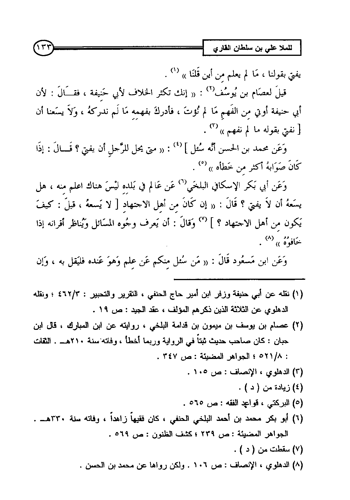 قيلَ لعصَام بن يُوسُف (¬2): ((إنك تكثر الخلاف لأبي حَنِيفة، فقَالَ: لأن أبي حنيفة أوتي مِن الفَهم مَا لم نُؤتَ، فأدرك بفهمِهِ مَا لَم ندركهُ، وَلاَ يسَعنا أن [نفتي بقوله ما لم نفهم)) (¬3).