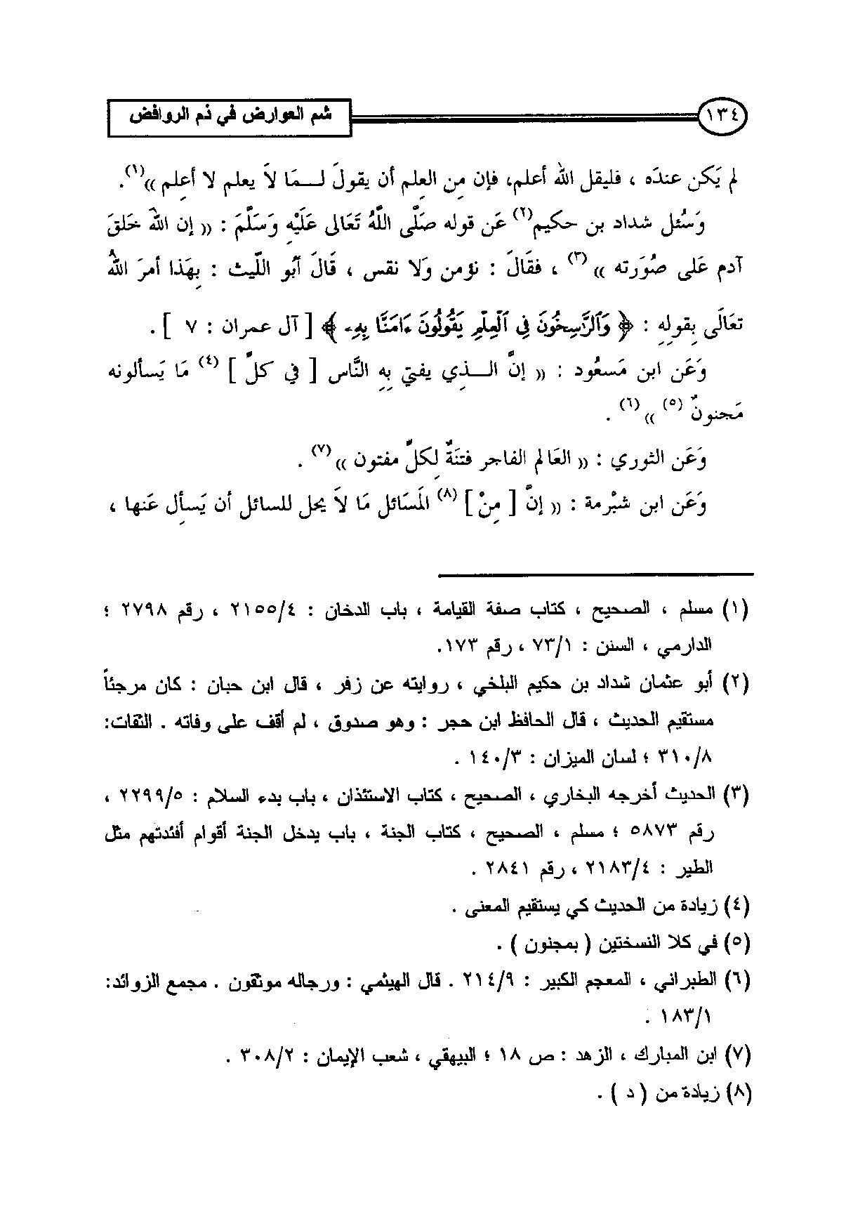 وَسُئل شداد بن حكيم (¬2) عَن قوله صَلَّى اللَّهُ تَعَالى عَلَيْهِ وَسَلَّمَ: ((إن اللهَ خَلقَ آدم عَلى صُوَرته)) (¬3)، فقَالَ: نؤمن وَلا نقس، قَالَ أبُو اللّيث: بِهَذا أمرَ اللهُ تعَالَى بِقولِهِ: {وَالرَّاسِخُونَ فِي الْعِلْمِ يَقُولُونَ آمَنَّا بِهِ} [آل عمران: 7].