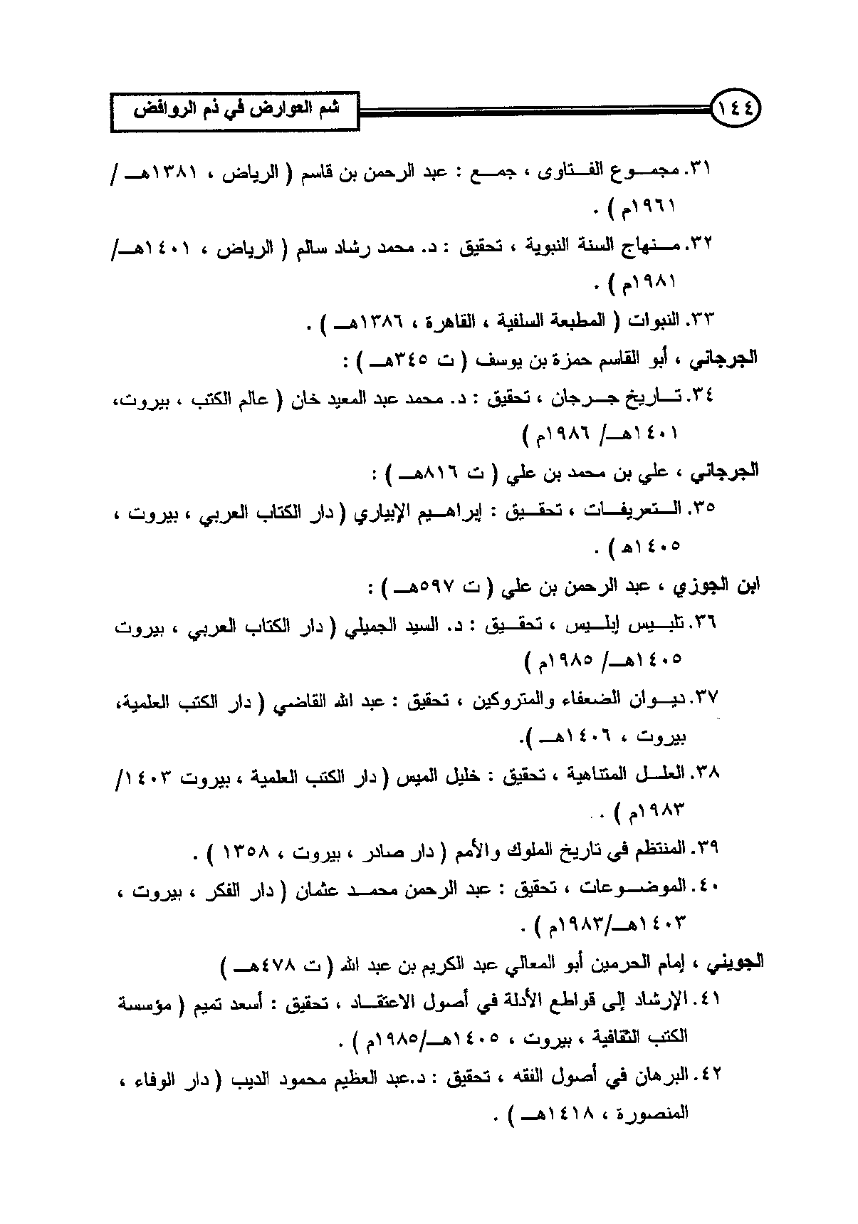 39. تلبيس إبليس، تحقيق: د. السيد الجميلي (دار الكتاب العربي، بيروت 1405هـ/ 1985م)