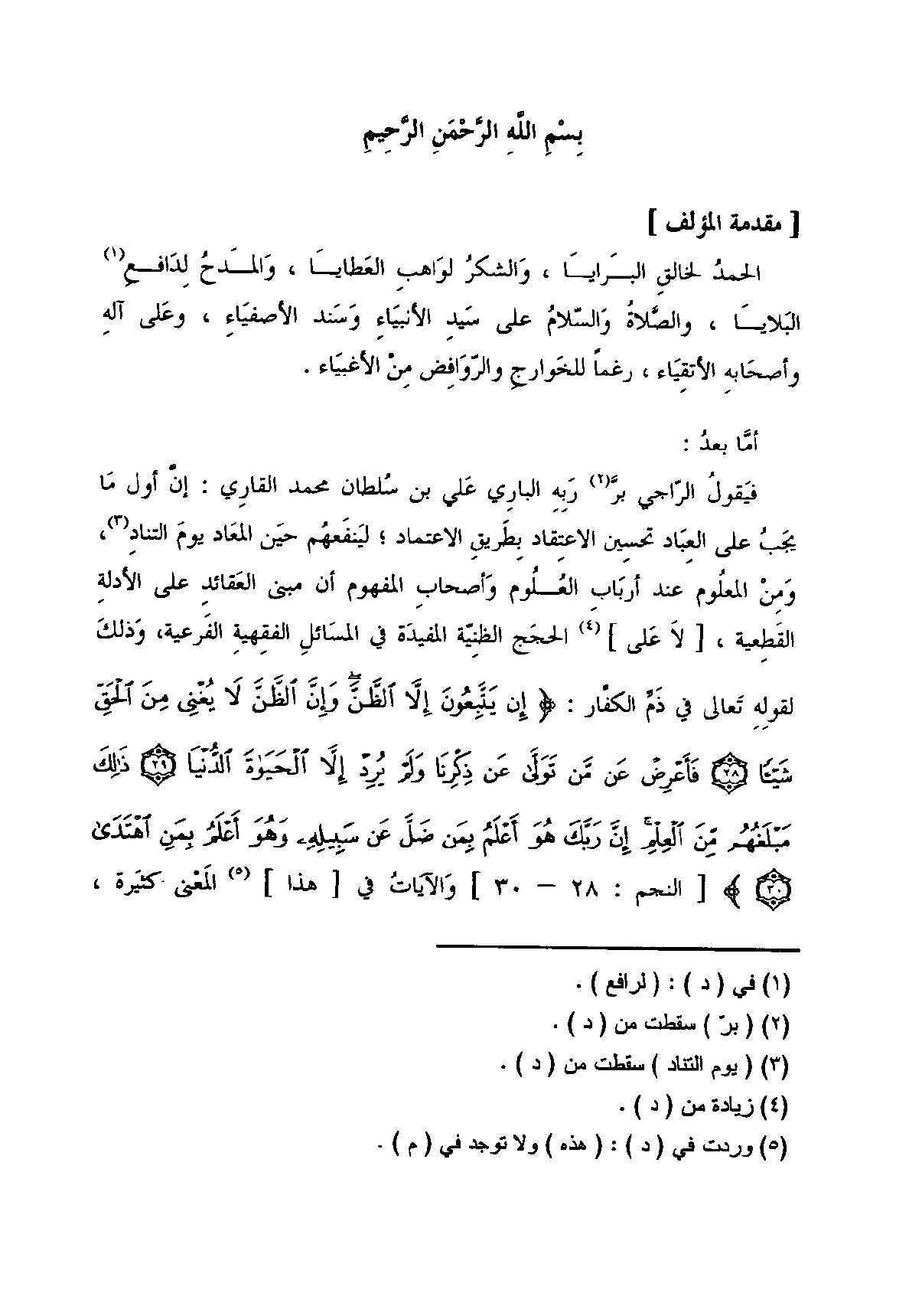 فيَقولُ الرّاجي برَّ (¬2) رَبِهِ البارِي عَلي بن سُلطان محمد القارِي: إنَّ أول مَا يجَبُ على العِبَاد تحسِين الاعتِقاد بِطَريقِ الاعتماد؛ ليَنفَعهُم حيَن المعَاد يومَ التنادِ (¬3)، وَمِنْ المعلُوم عند أربَابِ العُلُوم وَأصحابِ المفهوم أن مبنى العَقائدِ على الأدلةِ القَطِعية، [لاَ عَلى] (¬4) الحجَج الظنِيّة المفيدَة في المسَائلِ الفقِهيةِ الفَرعية، وَذلكَ لقولِهِ تَعالى في ذَمِّ الكفَّار: {إِنْ يَتَّبِعُونَ إِلاَّ الظَّنَّ وَإِنَّ الظَّنَّ لا يُغْنِي مِنَ الْحَقِّ شَيْئا ً فَأَعْرِضْ عَنْ مَنْ تَوَلَّى عَنْ ذِكْرِنَا وَلَمْ يُرِدْ إِلاَّ الْحَيَاةَ الدُّنْيَا ذَلِكَ مَبْلَغُهُمْ مِنَ الْعِلْمِ إِنَّ رَبَّكَ هُوَ أَعْلَمُ بِمَنْ ضَلَّ عَنْ سَبِيلِهِ وَهُوَ أَعْلَمُ بِمَنِ اهْتَدَى} [النجم: 28 - 30] وَالآيَاتُ في [هذا] (¬5) المَعْنى كثيَرة،