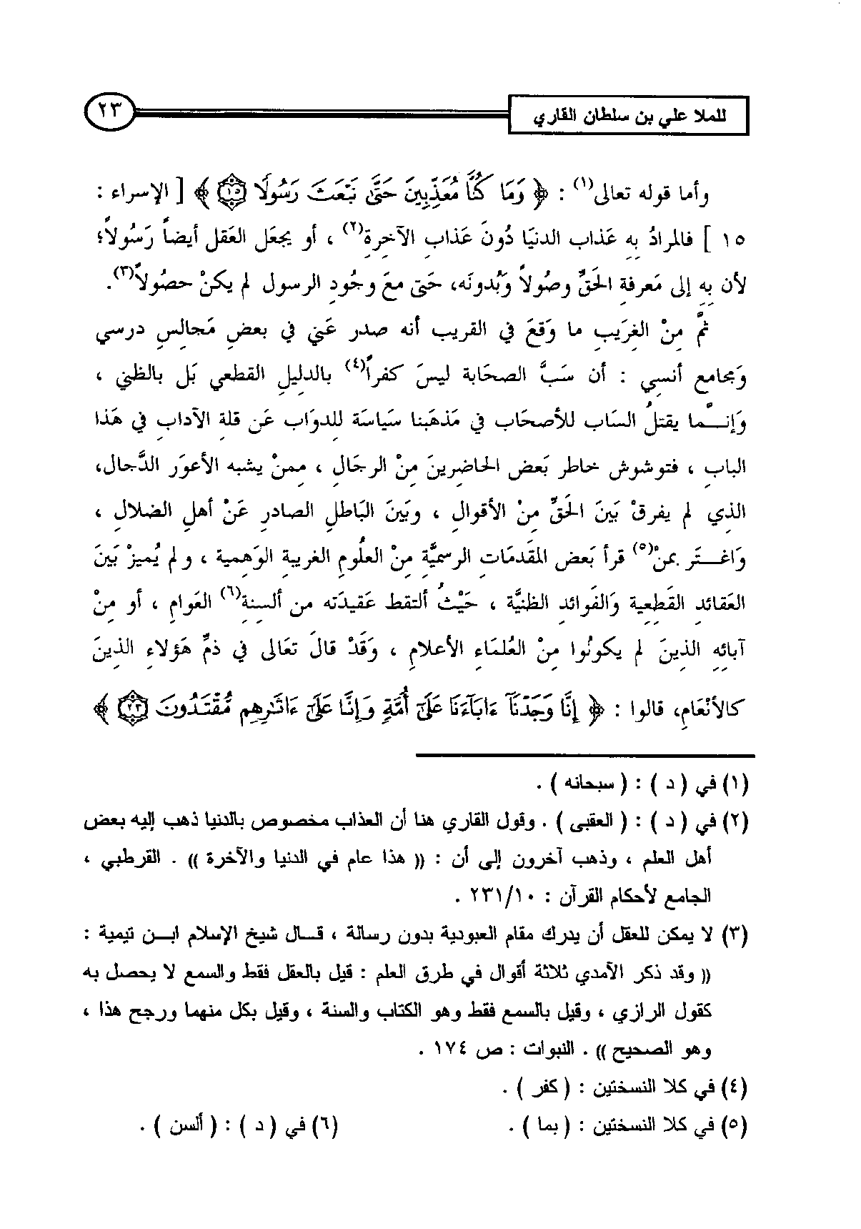 وأما قوله تعالى (¬1): {وَمَا كُنَّا مُعَذِّبِينَ حَتَّى نَبْعَثَ رَسُولاً} [الإسراء: 15] فالمرادُ بِهِ عَذاب الدنيَا دُونَ عَذابِ الآخِرةِ (¬2)، أو يجعَل العَقل أيضاً رَسُولاً؛ لأن بِهِ إلى مَعرفةِ الحَقِّ وصُولاً وَبُدونَه، حَتى معَ وجُودِ الرسول لم يكنْ حصُولاً (¬3).