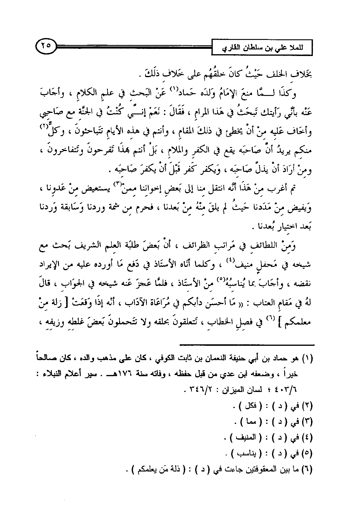 وكذَا لمَّا منعَ الإمَامُ وَلدَه حَماد (¬1) عَنْ البَحثِ في علمِ الكلامِ، وأجَابَ عَنْه بأنَّي رَأيتك تَبحَثُ في هَذا المرامِ، فَقَالَ: نَعَمْ إنَّي كُنْتُ في الجنَّةِ مع صَاحِبي وأخَاف عَليِه مِنْ أنْ يخطئ في ذلكَ المقامِ، وأنتم في هذِه الأيامِ تتَباحثونَ، وكلٌّ (¬2) منكِم يريدُ أنَّ صَاحبَه يقع في الكفرِ والملامِ، بَلْ أنتم بهذَا تَفرحونَ وتَتفاخرونَ، ومِنْ أرَادَ أنْ يذلَّ صَاحِبَه، وَيكفر كَفر قَبْلَ أنْ يكفرَ صَاحِبَه.