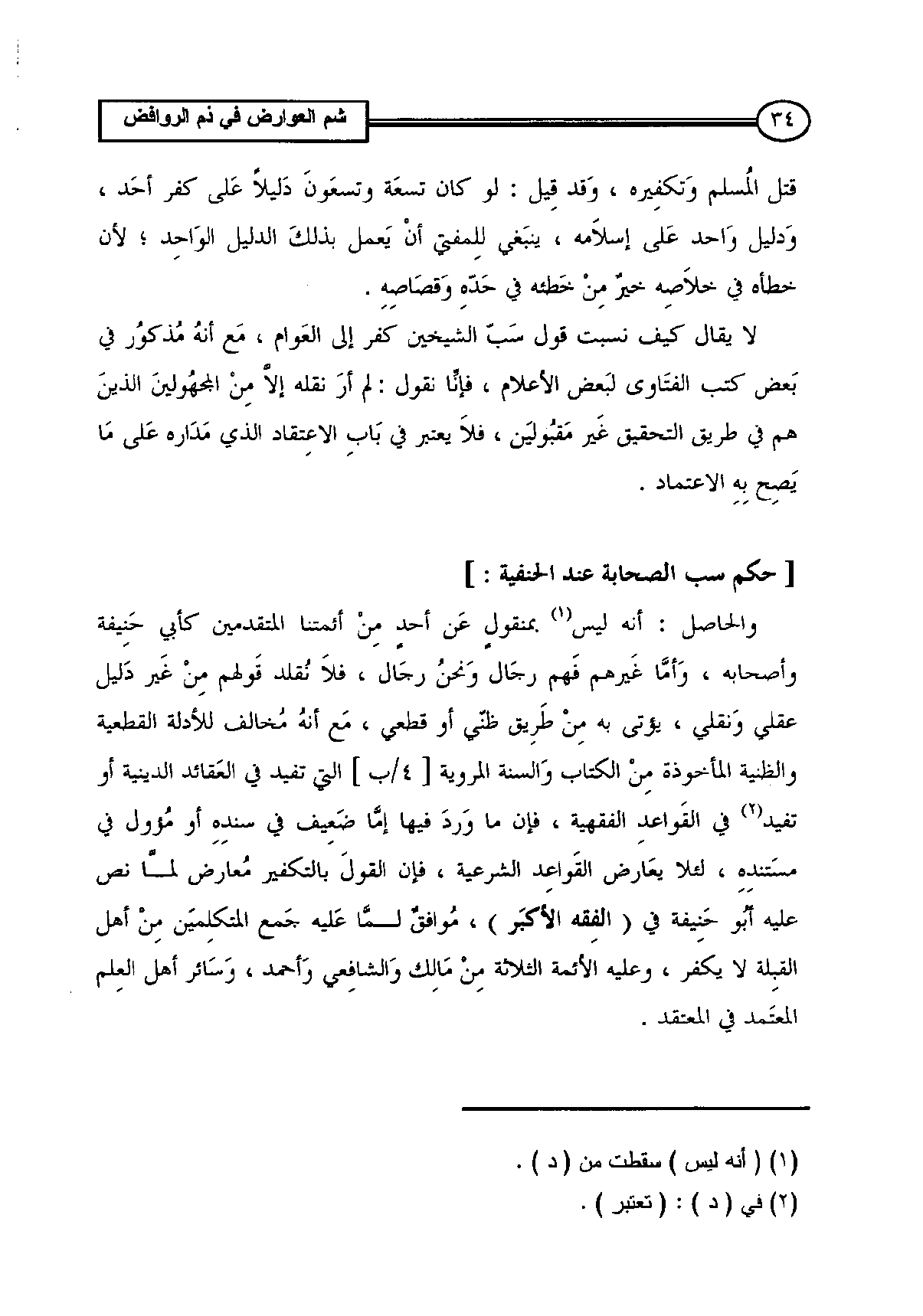 لا يقال كيف نسبت قول سَبّ الشيخين كفر إلى العَوام، مَع أنهُ مُذكوُر في بَعض كتب الفتَاوى لبَعض الأعلام، فإنِّا نقول: لم أرَ نقله إلاَّ مِنْ المجهُولينَ الذينَ هم في طريق التحقيق غَير مَقبُوليَن، فلاَ يعتبر في بَابِ الاعِتقاد الذي مَدَاره عَلى مَا يَصِح بِهِ الاعتماد.