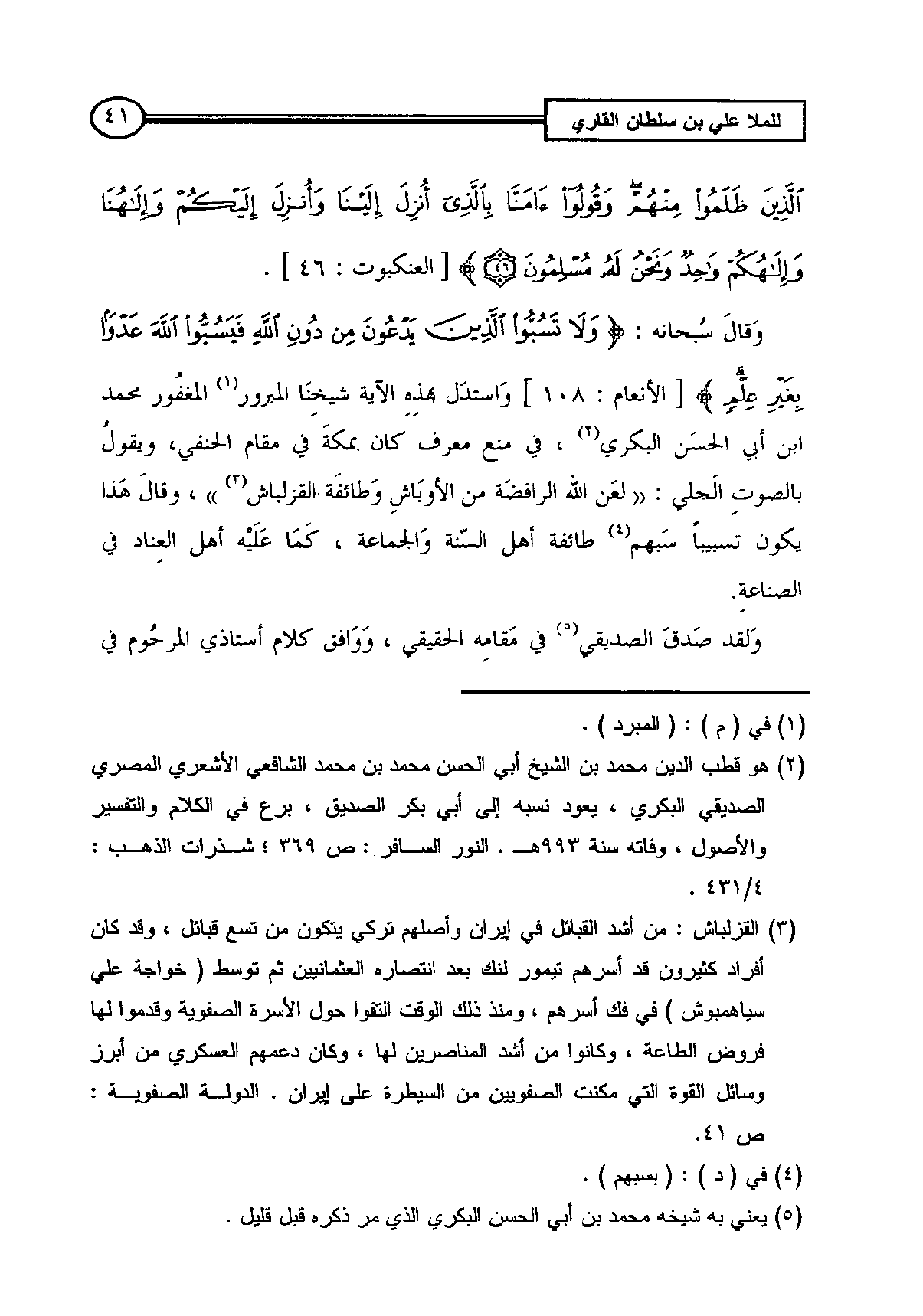وَقالَ سُبحانه: {وَلا تَسُبُّوا الَّذِينَ يَدْعُونَ مِنْ دُونِ اللَّهِ فَيَسُبُّوا اللَّهَ عَدْواً بِغَيْرِ عِلْمٍ} [الأنعام: 108] وَاستدَل بهذِهِ الآية شيخِنَا المبرور (¬1) المغفُور محمد بن أبي الحسَن البكري (¬2)، في منع معرف كان بمكةَ في مقام الحنفي، ويقولُ بالصوتِ الَجلي: ((لعَن الله الرافضَة من الأوبَاشِ وَطائفَة القزلباش (¬3)))، وقالَ هَذا يكون تسبيباً سَبهم (¬4) طائفة أهل السّنة وَالجماعة، كَمَا عَلَيْه أهل العِناد في الصناعةِ.