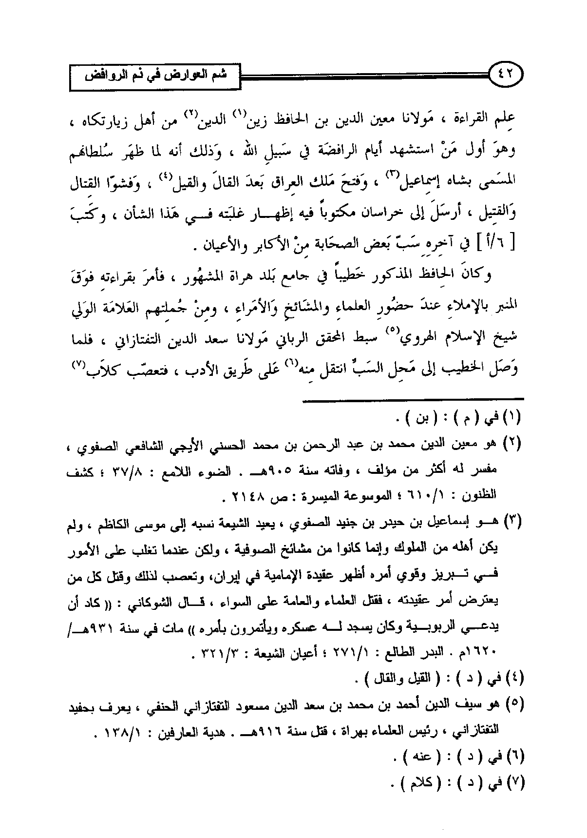 (¬5) هو سيف الدين أحمد بن محمد بن سعد الدين مسعود التفتازاني الحنفي، يعرف بحفيد التفتازاني، رئيس العلماء بهراة، قتل سنة 916هـ. هدية العارفين: 1/ 138.