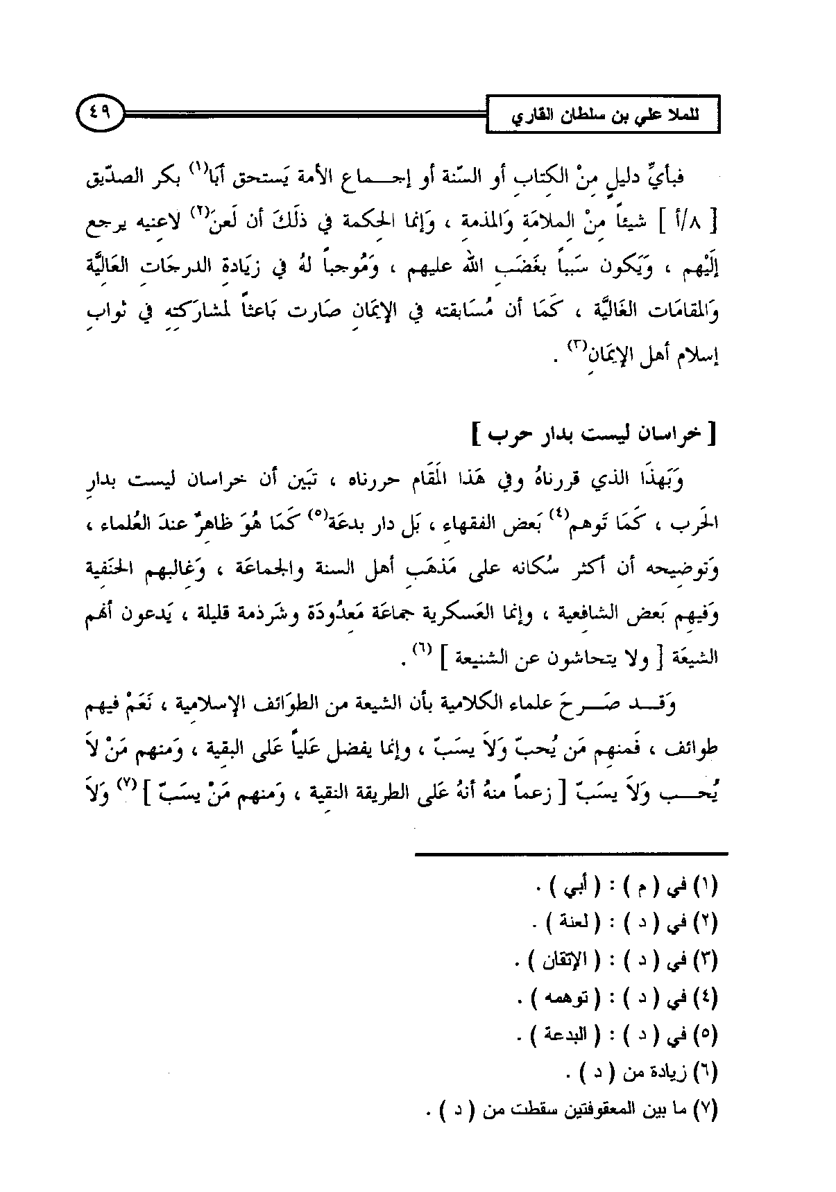 وَبَهذَا الذي قررناهُ وفي هَذا المَقَام حررناه، تبَين أن خراسان ليست بدارِ الحَرب، كَمَا تَوهم (¬4) بَعض الفقهاءِ، بَل دار بدعَة (¬5) كَمَا هُوَ ظاهِرٌ عندَ العُلماء، وَتوضِيحه أن أكثر سُكانه على مَذهَبِ أهل السنة والجماعَة، وَغِالبهم الحنَفِية وَفيهِم بَعض الشافِعية، وإنما العَسكرية جماعَة مَعِدُودَة وشَرذمة قليلة، يَدعون أنهم الشيعَة [ولا يتحاشون عن الشنيعة] (¬6).