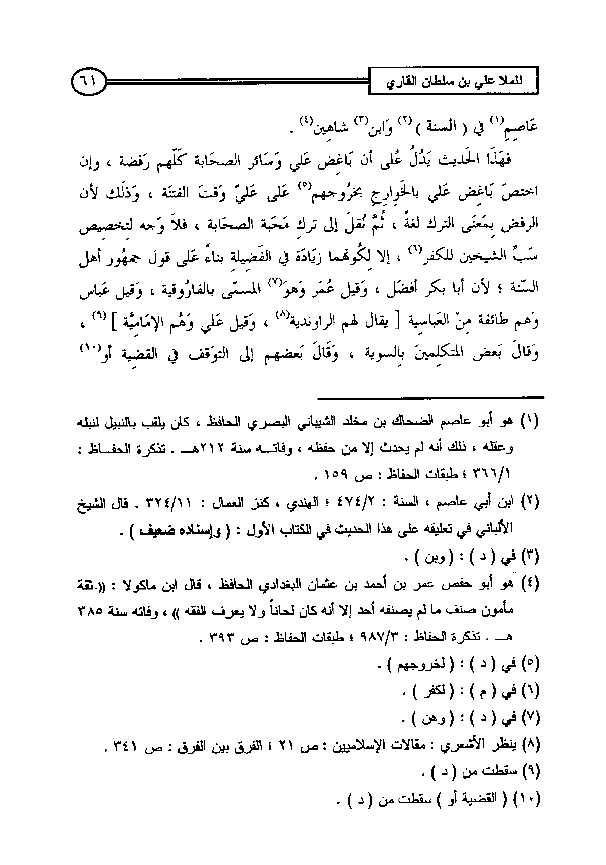 فهَذَا الحَديث يَدُلُ عُلى أن بَاغِض عَلي وَسَائر الصحَابة كَلّهم رَفضة، وإن اختصَ بَاغِض عَلي بالخَوِارِجِ بخرُوجهم (¬5) عَلى عَليّ وَقتَ الفتنَة، وَذلَك لأن الرفض بِمَعنَى الترك لغةً، ثُمَّ نُقلَ إلى تركِ مَحَبة الصحَابة، فلاَ وَجه لتِخصِيص سَبِّ الشيخين للكفر (¬6)، إلا لِكُونهما زيَادَة في الفَضِيلةِ بناءً عَلى قول جمهُور أهل السّنة؛ لأن أبا بكر أفضَل، وَقيل عُمَر وَهوَ (¬7) المسمّى بالفارُوقية، وَقيل عَباس وَهم طائفة مِنْ العَباسِية [يقال لهم الراوندية (¬8)، وَقيل عَلي وَهُم الإمَامِيَّة] (¬9)، وَقالَ بَعض المتكلِمينَ باِلسوية، وقال بَعضهم إلى التوَقف في القضِية أو (¬10)
