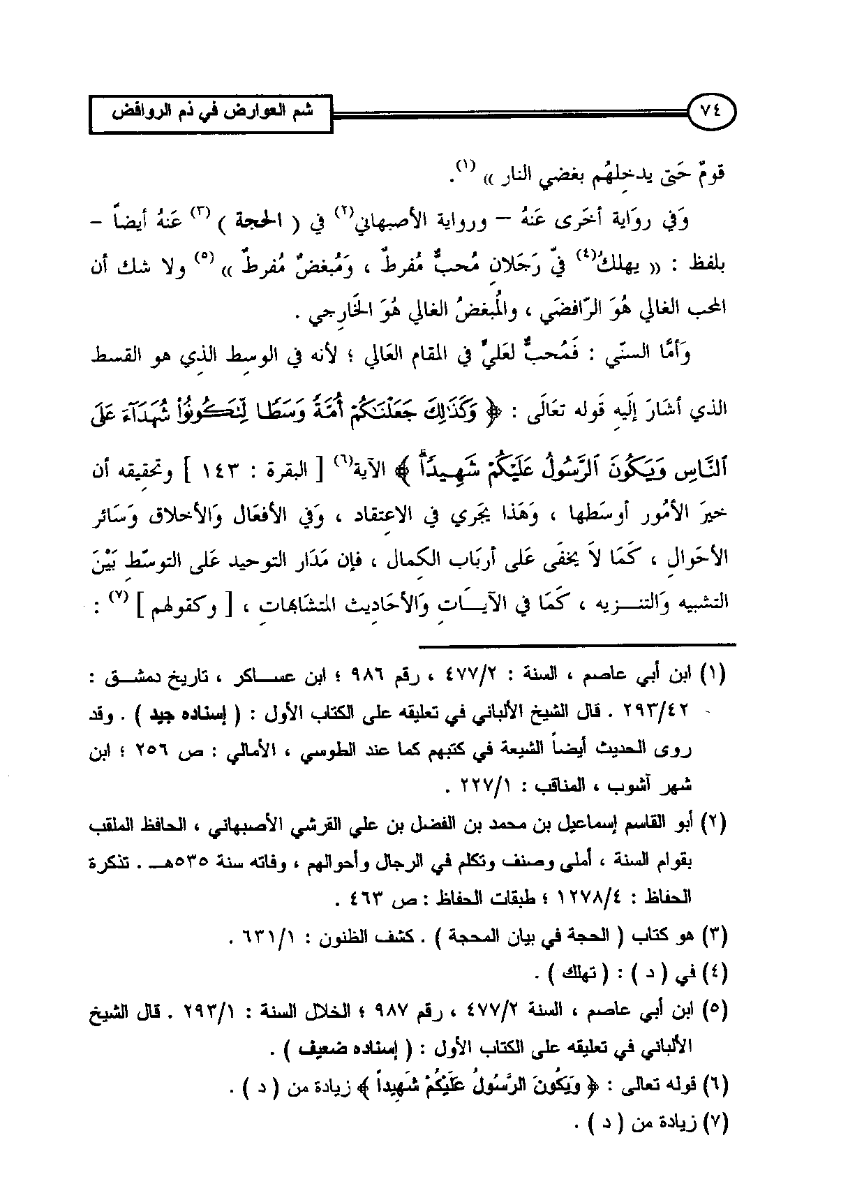 وَفي روَاية أخَرى عَنهُ - ورواية الأصبهاني (¬2) في (الحجة) (¬3) عَنهُ أيضاً - بلفظ: ((يهلكُ (¬4) فيّ رَجَلانِ مُحبٌّ مُفرطٌ، وَمُبغضٌ مُفرطٌ)) (¬5) ولا شك أن المحب الغالي هُوَ الرّافضَي، والمُبغضُ الغالي هُوَ الخَارِجي.