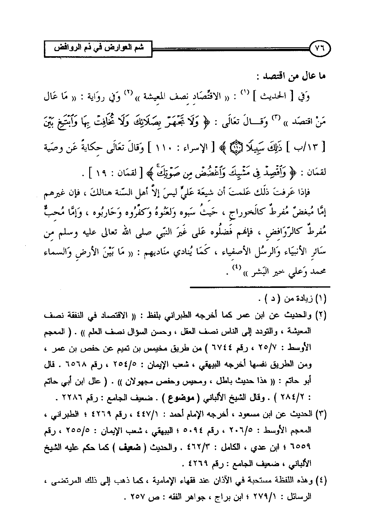 وَفي [الحديث] (¬1): ((الاقتِّصَادِ نِصف المعِيشة)) (¬2) وَفي روَاية: ((مَا عَال مَنْ اقتصَد)) (¬3) وَقال تعَالَى: {وَلا تَجْهَرْ بِصَلاتِكَ وَلا تُخَافِتْ بِهَا وَابْتَغِ بَيْنَ [13/ب] ذَلِكَ سَبِيلاً} [الإسراء: 110] وَقالَ تعَالَى حِكايةً عَن وصَية لقمَان: {وَاقْصِدْ فِي مَشْيِكَ وَاغْضُضْ مِنْ صَوْتِكَ} [لقمَان: 19].