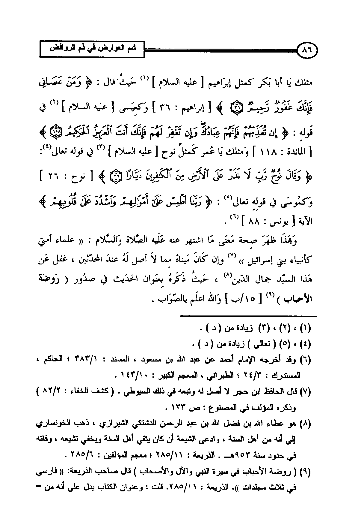 وَبهَذَا ظهَرَ صِحة مَعنَى مَا اشتهر عنه عَلَيه الصَّلاة وَالسَّلام: ((علماء أمتي كأنبياء بني إسرائيل)) (¬7) وإن كَانَ مَبناهُ مِما لاَ أصل لَهُ عندَ المحدّثين، غفل عَن هَذا السيّد جمال الدّين (¬8)، حَيثُ ذَكَرهُ بِعنَوان الحدَيث في صدُور (رَوضَة الأحباب) (¬9) [15/ب] وَالله اعلَم بالصّوَاب.