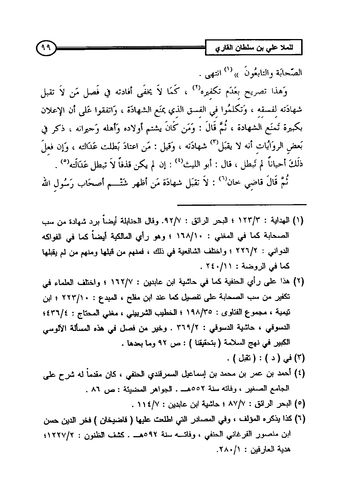 (¬1) الهداية: 3/ 123؛ البحر الرائق: 7/ 92. وقال الحنابلة أيضاً برد شهادة من سب الصحابة كما في المغني: 10/ 168؛ وهو رأي المالكية أيضاً كما في الفواكه الدواني: 2/ 226؛ واختلف الشافعية في ذلك فمنهم من قبلها ومنهم من لم يقبلها كما في الروضة: 11/ 240.
