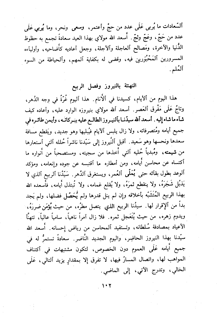 هذا اليوم من الأيام، كسيدنا في الأنام. هذا اليوم غرة في وجه الدهر، وتاج على مفرق العصر. أسعد الله مولاي بنيروزه الوارد عليه، وأعاده كيف شاء ما شاء إليه. أسعد الله سيدنا بالنيروز الطالع عليه ببركاته، وأيمن طائره في جميع أيامه ومتصرفاته، ولا زال يلبس الأيام فيبليها وهو جديد، ويقطع مسافة سعدها ونحسها وهو سعيد. أقبل النيروز إلى سيدنا ناشراً حلله التي استعارها من شيمته، ومبدياً حليه التي أخذها من سجيته، ومستصحباً من أنواره ما اكتساه عن محاسن أيامه، ومن أمطاره ما اقتبسه عن جوده وإنعامه، ومؤكد الوعد بطول بقائه حتى يملى العمر ويستغرق الدهر. سيدنا الربيع الذي لا يذبل شجره، ولا ينقطع ثمره، ولا يقلع غمامه، ولا تبتذل أيامه، فأسعده الله بداً من الإقرار لها. سيدنا الربيع الذي يتصل مطره، من حيث يؤمن ضرره، ويدوم زهره، من حيث يتعجل ثمره. فلا زال آمراً ناهياً، سامياً عالياً، تتهنأ الأعياد بمصادفة سلطانه، وتستفيد المحاسن من رياض إحسانه. أسعد الله سيدنا بهذا النيروز الحاضر، واليوم الجديد الناضر. سعادة تستمر له في جميع أيامه على العموم دون الخصوص، لتكون مشتبهات في اكتناف المواهب لها، واتصال المسار فيها، لا تفرق إلا بمقدار يزيد التالي، على الخالي، وتدرج الآتي، إلى الماضي.