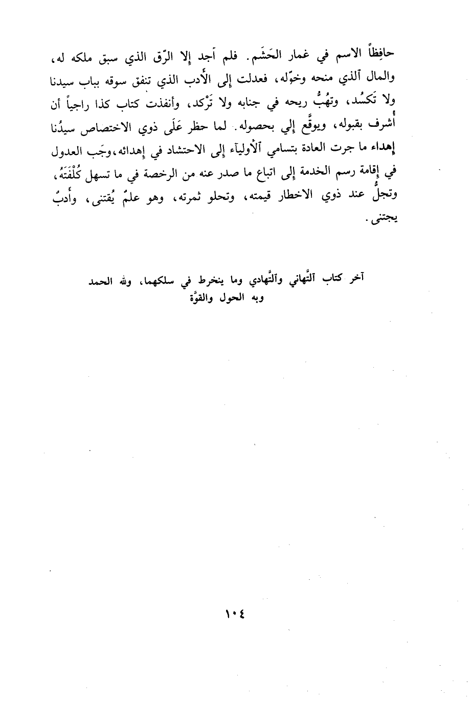 حافظاً الاسم في غمار الحشم. فلم أجد إلا الرق سبق ملكه له، والمال الذي منحه وخوله، فعدلت إلى الأدب الذي تنفق سوقه بباب سيدنا ولا تكسد، وتهب ريحه في جنابه ولا تركد، وأنفذت كتاب كذا راجياً أن أشرق بقبوله، ويوقع إلي بحصوله. لما حظر على ذوي الاختصاص سيدنا إهداء ما جرت العادة بتسامي الأولياء إلى الاحتشاد في إهدائه، وجب العدول في إقامة رسم الخدمة إلى اتباع ما صدر عنه من الرخصة في ما تسهل كلفته، وتجل عند ذوي الأخطار قيمته، وتحلو ثمرته، وهو علم يقتنى، وأدب يجتنى آخر كتاب التهاني والتهادي وما ينخرط في سلكهما، ولله الحمد وبه الحول والقوة