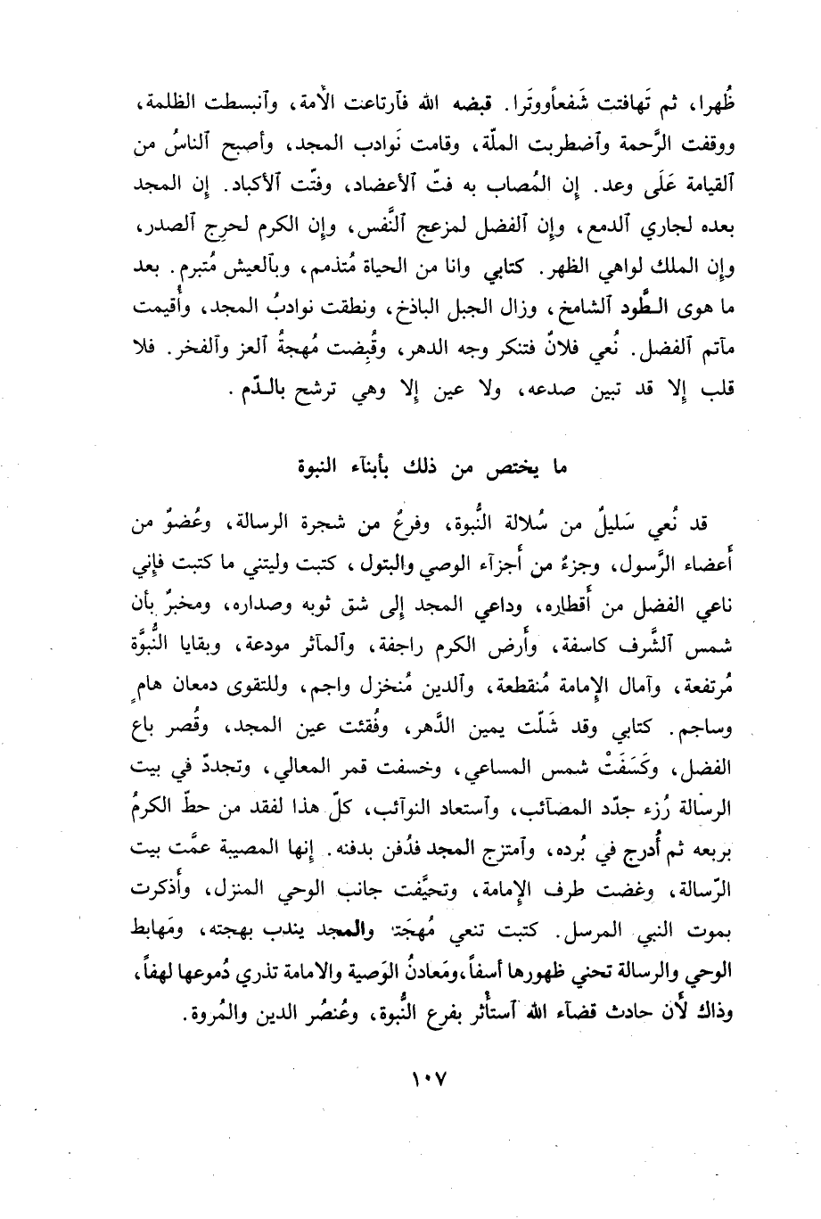 قد نعي سليل من سلالة النبوة، وفرع من شجرة الرسالة، وعضو من أعضاء الرسول، وجزء من أجزاء الوصي والبتول، كتبت وليتني ما كتبت فإني ناعي الفضل من أقطاره، وداعي المجد إلى شق ثوبه وصداره، ومخبر بأن شمس الشرف كاسفة، وأرض الكرم راجفة، والمآثر مودعة، وبقايا النبوة مرتفعة، وآمال الإمامة منقطعة، والدين منخزل واجم، وللتقوى دمعان هام وساجم. كتابي وقد شلت يمين الدهر، وفقئت عين المجد، وقصر باع الفضل، وكسفت شمس المساعي، وخسفت قمر المعالي، وتجدد في بيت الرسالة رزء جدد المصائب، واستعاد النوائب، كل هذا لفقد من حط الكرم بربعه ثم أدرج في برده، وامتزج المجد فدفن بدفنه. إنها المصيبة عمت بيت الرسالة، وغضت طرف الإمامة، وتحيفت جانب الوحي المنزل، وأذكرت بموت النبي المرسل. كتبت تنعي مهجته والمجد يندب بهجته، ومهابط الوحي والرسالة تحني ظهورها أسفاً، ومعادن الوصية والإمامة تذري دموعها لهفاً، وذاك لأن حادث قضاء الله استأثر بفرع النبوة، وعنصر الدين والمروة.