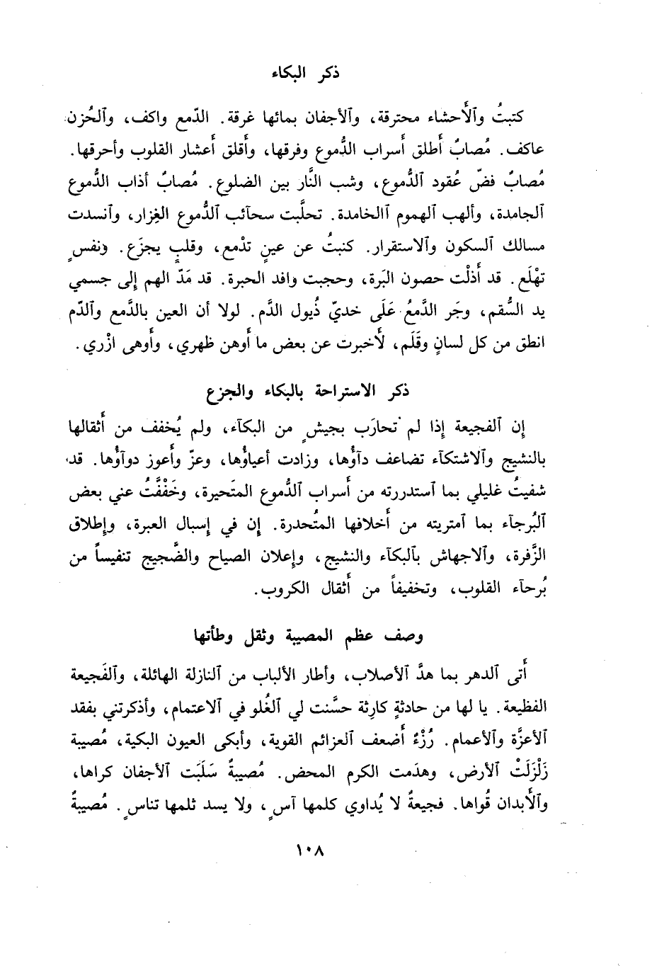 إن الفجيعة إذا لم تحارب بجيش من البكاء، ولم يخفف من أثقالها بالنشيج والاشتكاء تضاعف داؤها، وزادت أعياؤها، وعز وأعوز دواؤها. قد شفيت غليلي بما استدررته من أسراب الدموع المتحيرة، وخففت عني بعض البرجاء بما امتريته من أخلاقها المتحدرة. إن في إسبال العبرة، وإطلاق الزفرة، والاجهاش بالبكاء والنشيج، وإعلان الصياح والضجيج تنفيساً من برحاء القلوب، وتخفيفاً من أثقال الكروب.