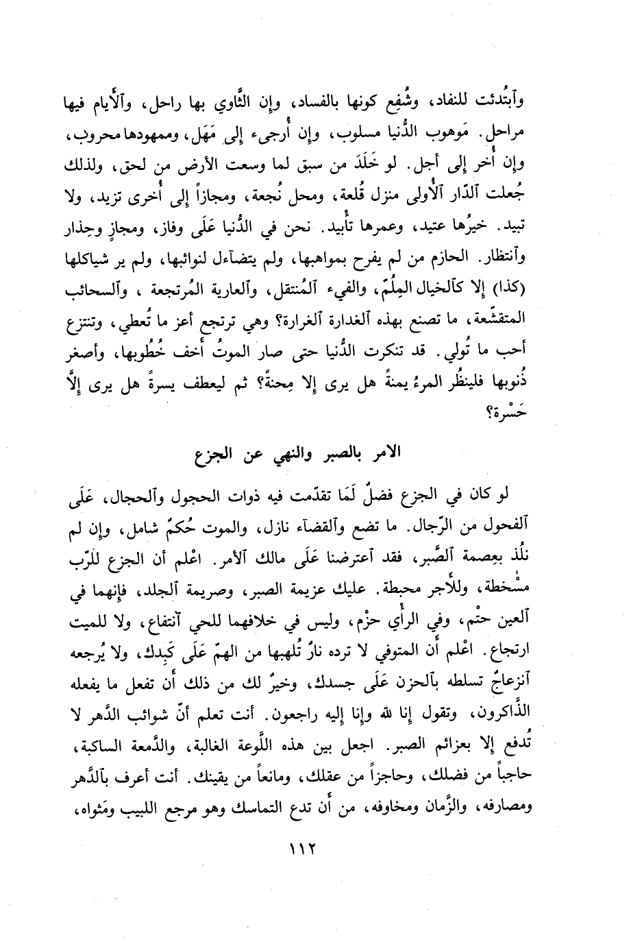 لو كان في الجزع فضل لما تقدمت فيه ذوات الحجول والحجال، على الفحول من الرجال. ما تضع والقضاء نازل، والموت حكم شامل، وإن لم نلذ بعصمة الصبر، فقد اعترضنا على مالك الأمر. اعلم أن الجزع للرب مسخطة، وللأجر محبطة. عليك عزيمة الصبر، وصريمة الجلد، فإنهما في العين حتم، وفي الرأي حزم، وليس في خلافهما للحي انتفاع، ولا للميت ارتجاع. اعلم أن المتوفي لا ترده نار تلهبها من الهم على كبدك، ولا يرجعه انزعاج تسلطه بالحزن على جسدك، وخير لك من ذلك أن تفعل ما يفعله الذاكرون، وتقول إنا لله وإنا إليه راجعون. أنت تعلم أن شوائب الدهر لا تدفع إلا بعزائم الصبر. اجعل بين هذه اللوعة الغالبة، والدمعة الساكبة، حاجباً من فضلك، وحاجزاً من عقلك، ومانعاً من يقينك. أنت أعرف بالدهر ومصارفه، والزمان ومخاوفه، من أن تدع التماسك وهو مرجع اللبيب ومثواه،