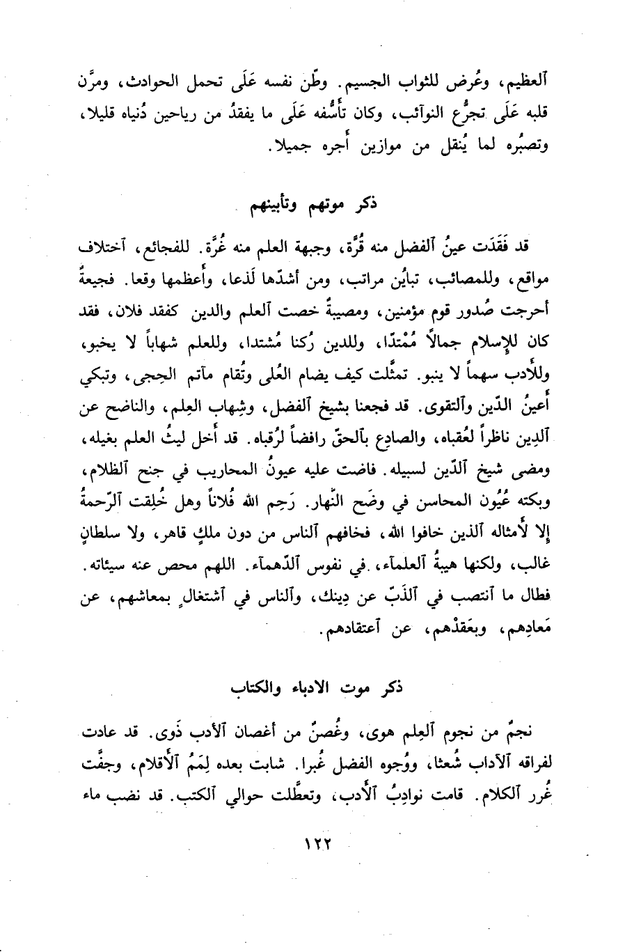 قد فقدت عين الفضل منه قرة، وجبهة العلم منه غرة. للفجائع، اختلاف مواقع، وللمصائب، تباين مراتب، ومن أشدها لذعا، وأعظمها وقعا. فجيعة أحرجت صدور قوم مؤمنين، ومصيبة خصت العلم والدين كفقد فلان، فقد كان للإسلام جمالاً ممتدا، وللدين ركنا مشتدا، وللعلم شهاباً لا يخبو، وللأدب سهم لا ينبو. تمثلت كيف يضام العلى وتقام مآتم الحجى، وتبكي أعين الدين والتقوى. قد فجعنا بشيخ الفضل، وشهاب العلم، والناضح عن الدين ناظراً لعقباه، والصادع بالحق رافضاً لرقباه. قد أخل ليث العلم بغيله، ومضى شيخ الدين لسبيله. فاضت عليه عيون المحاريب في جنح الظلام، وبكته عيون المحاسن في وضح النهار. رحم الله فلاناً وهل خلقت الرحمة إلا لأمثاله الذين خافوا الله، فخافهم الناس من دون ملك قاهر، ولا سلطان غالب، ولكنها هيبة العلماء. في نفوس الدهماء. اللهم محص عن سيئاته. فطال ما انتصب في الذب عن دينك، والناس في اشتغال بمعاشهم، عن معادهم، وبعقدهم، عن اعتقادهم.