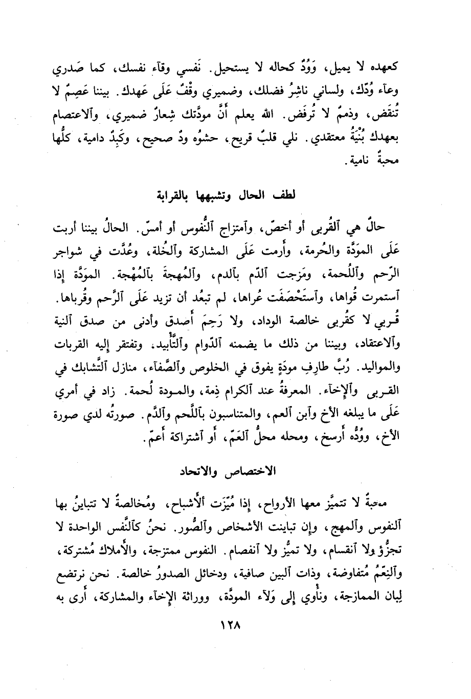 حال هي القربى أو أخص، وامتزاج النفوس أو أمس. الحال بيننا أربت على المودة والحرمة، وأرمت على المشاركة والخلة، وعدت في شواجر الرحم واللحمة، ومزجت الدم بالدم، والمهجة بالمهجة. المودة إذا استمرت قواها، واستحصفت عراها، لم تبعد أن تزيد على الرحم وقرباها. قربي لا كقربى خالصة الوداد، ولا رحم أصدق وأدنى من صدق النية والاعتقاد، وبيننا من ذلك ما يضمنه الدوام والتأبيد. وتفتقر إليه القربات والمواليد. رب طارف مودة يفوق في الخلوص والصفاء، منازل التشابك في القربى والإخاء. المعرفة عند الكرام ذمة، والمودة لحمة. زاد في أمري على ما يبلغه الأخ وابن العم، والمتناسبون باللحم والدم. صورته لدي صورة الأخ، ووده أرسخ، ومحله محل العم، أو اشتراكة أعم.