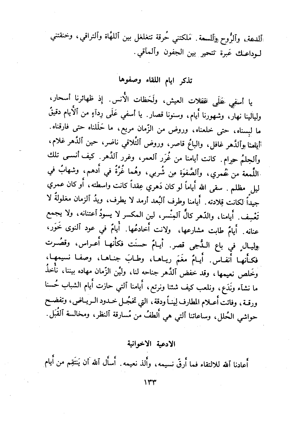 يا أسفي على غفلات العيش، ولحظات الأنس. إذ ظهائرنا أسحار، وليالينا نهار، وشهورنا أيام، وسنونا قصار. يا أسفي على رداء من الأيام دقيق ما لبسناه، حتى خلعناه، وروض من الزمان مريع، ما حللناه حتى فارقناه. أيامنا والدهر غافل، والباع قاصر، وروض التلاقي ناضر، حين الدهر غلام، والحلم حرام. كانت أيامنا من غرر العمر، وغرر الدهر. كيف أنسى تلك اللمعة من عمري، والصفوة من شربي، وهما غرة في أدهم، وشهاب في ليل مظلم. سقى الله أياماً لو كان دهري عقداً كانت واسطته، أو كان عمري جيداً لكانت قلادته. أيامنا وطرف البعد أرمد لا يطرف، ويد الزمان مغلولة لا تعسف. أيامنا، والدهر كال المنسر، لين المكسر لا يسود اعتنانه، ولا يجمع عنانه. أيام طابت مشارعها، ولانت أخادعها. أيام في عود النوى خور، وليال في باع الدجى قصر. أيام حسنت فكأنها أعراس، وقصرت فكأنها أنفاس. أيام مغم رياها، وطاب جناها، وصفا نسيمها، وخلص نعيمها، وقد خفض الدهر جناحه لنا، ولين الزمان مهاوة بيننا، نأخذ ما نشاء وندع، ونلعب كيف شئنا ونرتع، أيامنا التي حازت أيام الشباب حسنا ورقة، وفاتت أعلام المطارف لينا ودقة، التي تخجل خدود الرياض وتفضح حواشي الحلل، وساعاتنا التي هي ألطف من مسارقة النظر، ومخالسة القبل.