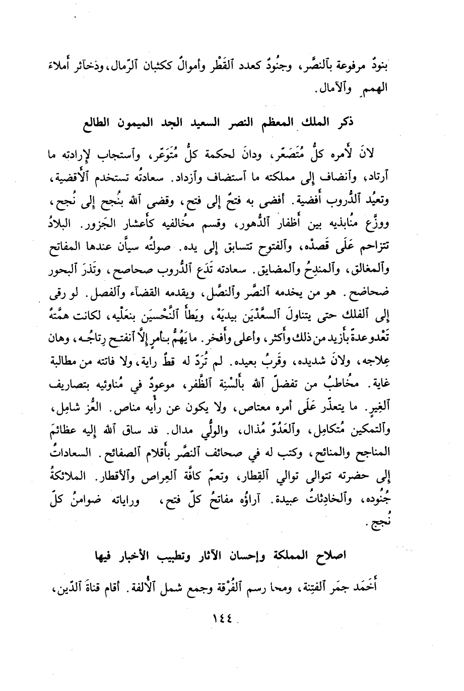 لان أمره كل متصعر، ودان لحكمة كل متوغر، واستجاب لإرادته ما ارتاد، وانضاف إلى مملكته ما استضاف وازداد. سعادته تستخدم الأقضية، وتعيد الدروب أفضية. أفضى به فتح إلى فتح، وقضى الله بنجح إلى نجح، ووزع منابذيه بين أظفار الدهور، وقسم مخالفيه كأعشار الجزور. البلاد تتزاحم على قصده، والفتوح تتسابق إلى يده. صولته سيان عندها المفاتح والمغالق، والمندح والمضايق. سعادته تدع الدروب صحاصح، وتذر البحور ضحاضح. هو من يخدمه النصر والنصل، ويقدمه القضاء والفصل. لو رقى إلى الفلك حتى يتناول السعدين بيديه، ويطأ النحسين بنعليه، لكانت همته تعدو عدة بأزيد من ذلك وأكثر، وأعلى وأفخر. ما يهم بأمر إلا انفتح رتاجه، وهان علاجه ولان شديده، وقرب بعيده. لم ترد له قط راية، ولا فاتته من مطالبة غاية. مخاطب من تفضل الله بألسنة الظفر، موعود في مناوئيه بتصاريف الغير. ما يتعذر على أمره معتاص، ولا يكون عن رأيه مناص. العز شامل، والتمكين متكامل، والعدو مذال، والولي مدال. قد ساق الله إليه عظائم المناجح والمنائح، وكتب له في صحائف النصر بأقلام الصفائح. السعادات إلى حضرته تتوالى توالي القطار، وتعم كافة العراص والأقطار. الملائكة جنوده، والخادثات عبيدة. آراؤه مفاتح كل فتح، وراياته ضوامن كل نجج.