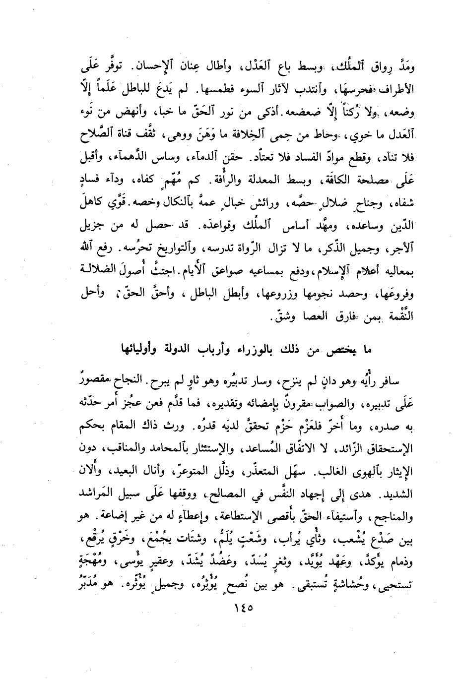 سافر رأيه وهو دان لم ينزح، وسار تدبيره وهو ثاو لم يبرح. النجاح مقصور على تدبيره، والصواب مقرون بإمضائه وتقديره، فما قدم فعن عجز أمر حدثه به صدره، وما أخر فلعزم حزم تحقق لديه قدره. ورث ذاك المقام بحكم الإستحقاق الزائد، لا الاتفاق المساعد، والإستئثار بالمحامد والمناقب، دون الإيثار بالهوى الغالب. سهل المتعذر، وذلل المتوعر، وأنال البعيد، وألان الشديد. هدى إلى إجهاد النفس في المصالح، ووقفها على سبيل المراشد والمناجح، واستيفاء الحق بأقصى الإستطاعة، وإعطاء له من غير إضاعة. هو بين صدع يشعب، وثأي يرأب، وشعث يلم، وشتات يجمع، وخرق يرقع، وذمام يؤكد، وعهد يؤيد، وثغر يسد، وعضد يشد، وعقير يؤسى، ومهجة تسحيى، وحشاشة تستبقى. هو بين نصح يؤثره، وجميل يؤثره. هو مدبر