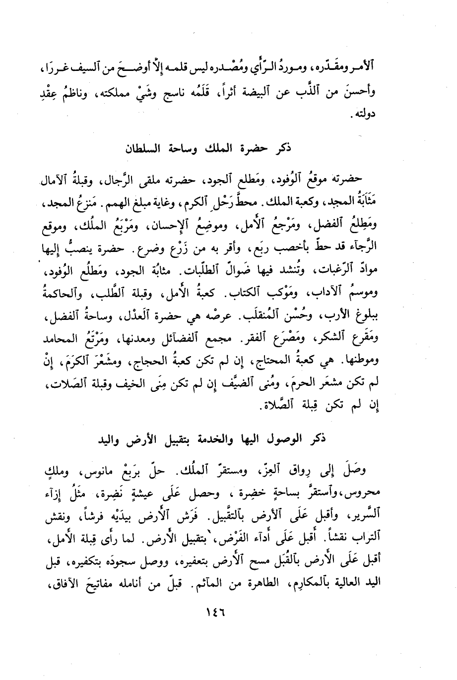 حضرته موقع الوفود، ومطلع الجود، حضرته ملقى الرجال، وقبلة الآمال مثابة المجد، وكعبة الملك. محط رحل الكرم، وغاية مبلغ الهمم. منزع المجد، ومطلع الفضل، ومرجع الأمل، وموضع الإحسان، ومربع الملك، وموقع الرجاء قد حط بأخصب ربع، وأقر به من زرع وضرع. حضرة ينصب إليها مواد الرغبات، وتنشد فيها ضوال الطلبات. مثابة الجود، ومطلع الوفود، وموسم الآداب، وموكب الكتاب. كعبة الأمل، وقبلة الطلب، والحاكمة ببلوغ الأرب، وحسن المنقلب. عرصه هي حضرة العدل، وساحة الفضل، ومقرع الشكر، ومصرع الفقر. مجمع الفضائل ومعدنها، ومرتع المحامد وموطنها. هي كعبة المحتاج، إن لم تكن كعبة الحجاج، ومشعر الكرم، إن لم تكن مشعر الحرم، ومنى الضيف إن لم تكن منى الخيف وقبلة الصلات، إن لم تكن قبلة الصلاة.