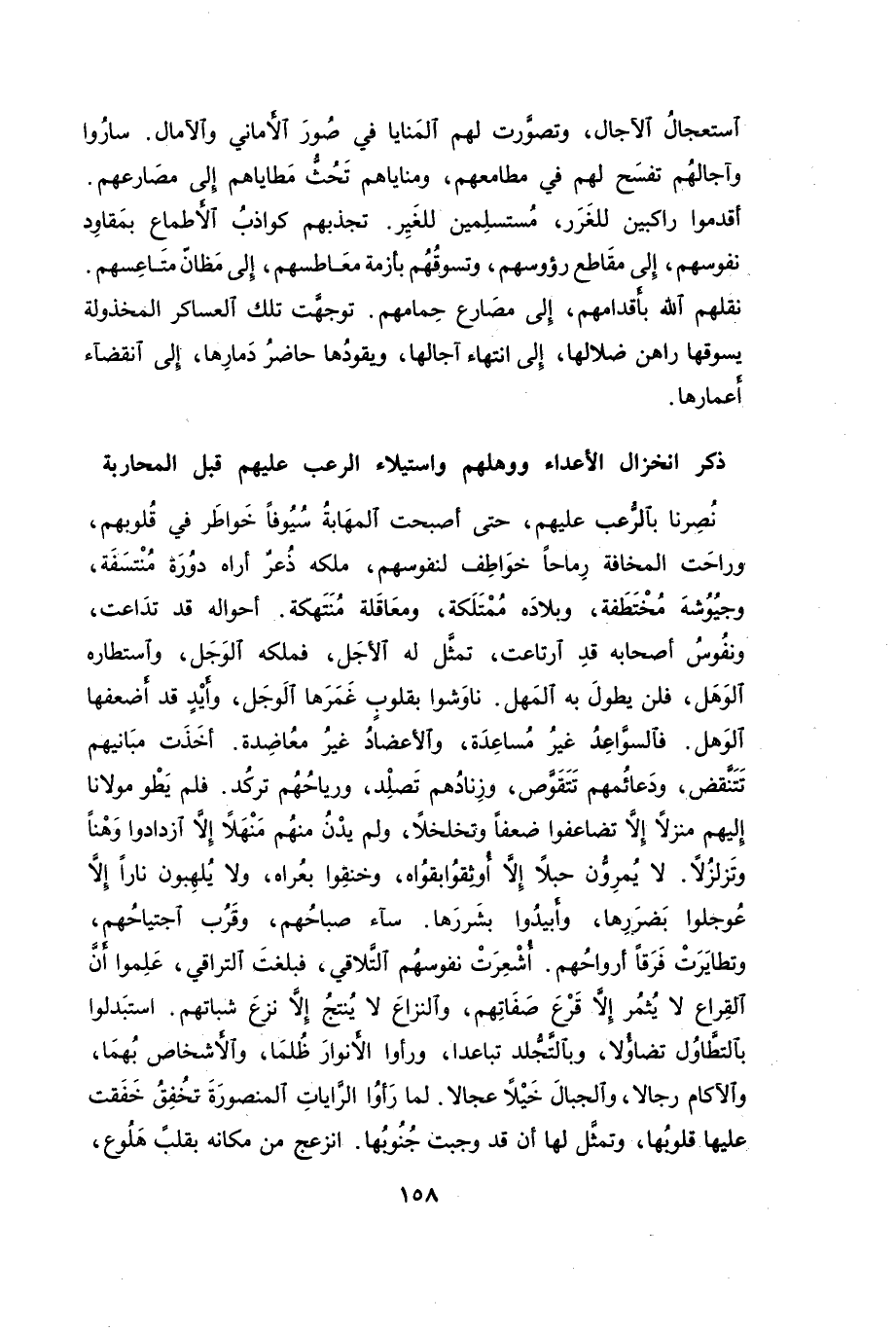 نصرنا بالرعب عليهم، حتى أصبحت المهابة سيوفاً خواطر في قلوبهم، وراحت المخافة رماحاً خواطف لنفوسهم، ملكه ذعر أراه دورة متسفة، وجيوشه مختطفة، وبلاده ممتلكة، ومعاقله منتهكة. أحواله قد تداعت، ونفوس أصحابه قد ارتاعت، تمثل له الأجل، فملكه الوجل، واستطاره الوهل، فلن يطول به المهل. ناوشوا بقلوب غمرها الوجل، وأيد قد أضعفها الوهل. فالسواعد غير مساعدة والأعضاد غير معاضدة. أخذت مبانيهم تتنقض، ودعائمهم تتقوص، وزنادهم تصلد، ورياحهم تركد. فلم يطو مولانا إليهم منزلاً إلا تضاعفوا ضعفاً وتخلخلاً، ولم يدن منهم منهلاً إلا ازدادوا وهناً وتزلزلاً. لا يمرون حبلاً إلا أوثقوا بقواه، وخنقوا بعراه، ولا يلهبون ناراً إلا عوجلوا بضررها، وأبيدوا بشررها. ساء صباحهم، وقرب اجتياحهم، وتطايرت فرقاً أرواحهم. أشعرت نفوسهم التلاقي، فبلغت التراقي، علموا أن القراع لا يثمر إلا قرع صفاتهم، والنزاع لا ينتج إلا نزع شباتهم. استبدلوا بالتطاول تضاؤلا، وبالتجلد تباعدا، ورأوا الأنوار ظلما، والأشخاص بهما، والآكام رجالا، والجبال خيلاً عجالا. لما رأوا الرايات المنصورة تخفق خفقت عليها قلوبها، وتمثل لها أن قد وجدت جنوبها. انزعج من مكانه بقلب هلوع،
