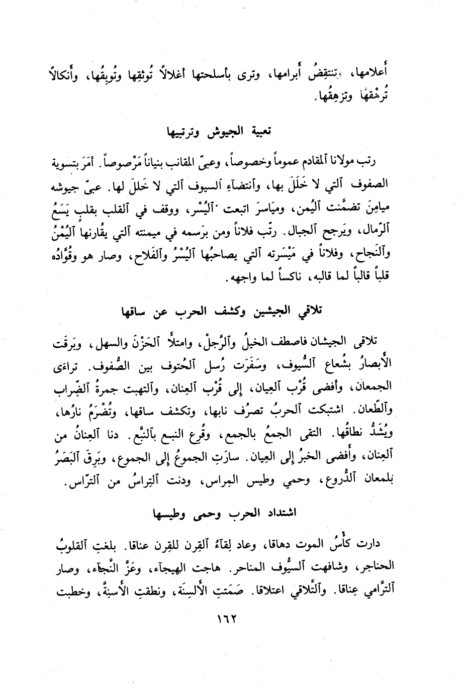 تلاقى الجيشان فاصطف الجيل والرجل، وامتلأ الحزن والسهل، وبرقت الأبصار بشعاع السيوف، وسفرت رسل الحتوف بين الصفوف. تراءى الجمعان، وأفضى قرب العيان، إلى قرب العنان، والتهبت جمرة الضراب والطعان. اشتبكت الحرب تصرف نابها، وتكشف ساقها، وتضرم نارها، ويشد نطاقها. التقى الجمع بالجمع، وقرع النبع بالنبع. دنا العنان من العنان، وأفضى الخبر إلى العيان. سارت الجموع إلى الجموع، وبرق البصر بلمعان الدروع، وحمي وطيس المراس، ودنت التراس من التراس.