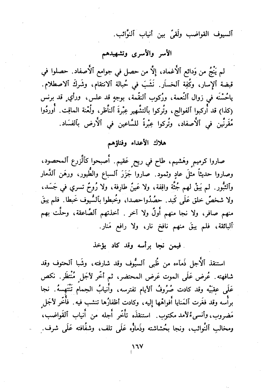 صاروا كرميم وهشيم، طاح في ريح عقيم. اصبحوا كالزرع المحصود، وصاروا حديثاً مثل عاد وثمود. صاروا جزر السباع والطيور، ورهن الدمار والثبور. لمم يبق لهم جثة واقفة، ولا عين طارفة، ولا روح تسري في جسد، ولا شخص خلق على كبد. حصدوا حصدا، وخبطوا بالسيوف خبطا. فلم يبق منهم صافر، ولا نجا منهم أول ولا آخر. أخذتهم الصاعقة، وحلت بهم البائقة، فلم يبق منهم نافخ نار، ولا رافع منار.