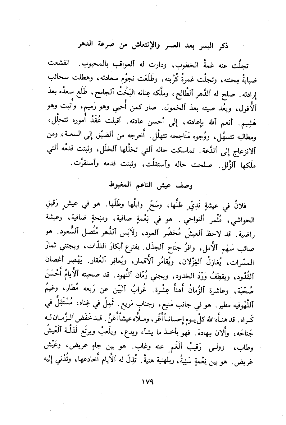 فلان في عيشة ندي ظلها، وسح وابلها وطلها. هو عيش رقيق الحواشي، مثمر النواحي. هو في نعمة صافية، ومنحة ضافية، وعيشة راضية. قد لاحظ العيش مخضر العود، ولابس الدهر متصل السعود. هو صائب سهم الأمل، وافر جناح الجذل. يفترع أبكار اللذات، ويجتني ثمار المسرات، يغازل الغزلان، ويقامر الأقمار، ويعاقر العقار. يهصر أغصان القدود، ويقطف ورد الخدود، ويجني رمان النهود. قد صحبته الأيام أحسن صحبة، وعاشرت الزمان أهنأ عشرة. غراب البين عن ربعه مطار، وغيم اللهو فيه مطير. هو في جانب منيع، وجناب مريع. ثمل في غناه، مستقل في كراه قد هنأه الله كل يوم إحساناً أغر، وملأه عيشاً أغن. قد خفض الزمان له جناحاً، وآلان مهاده. فهو يأخذ ما يشاء ويدع، ويلعب ويرتع لذلة العيش وطاب، وولى رقيب الغم عنه وغاب. هو بين جاه عريض، وعيش غريض. هو بين نعمة سنية، وبلهنية هنية. تذل له الأيام أخادعها، وتدني إليه