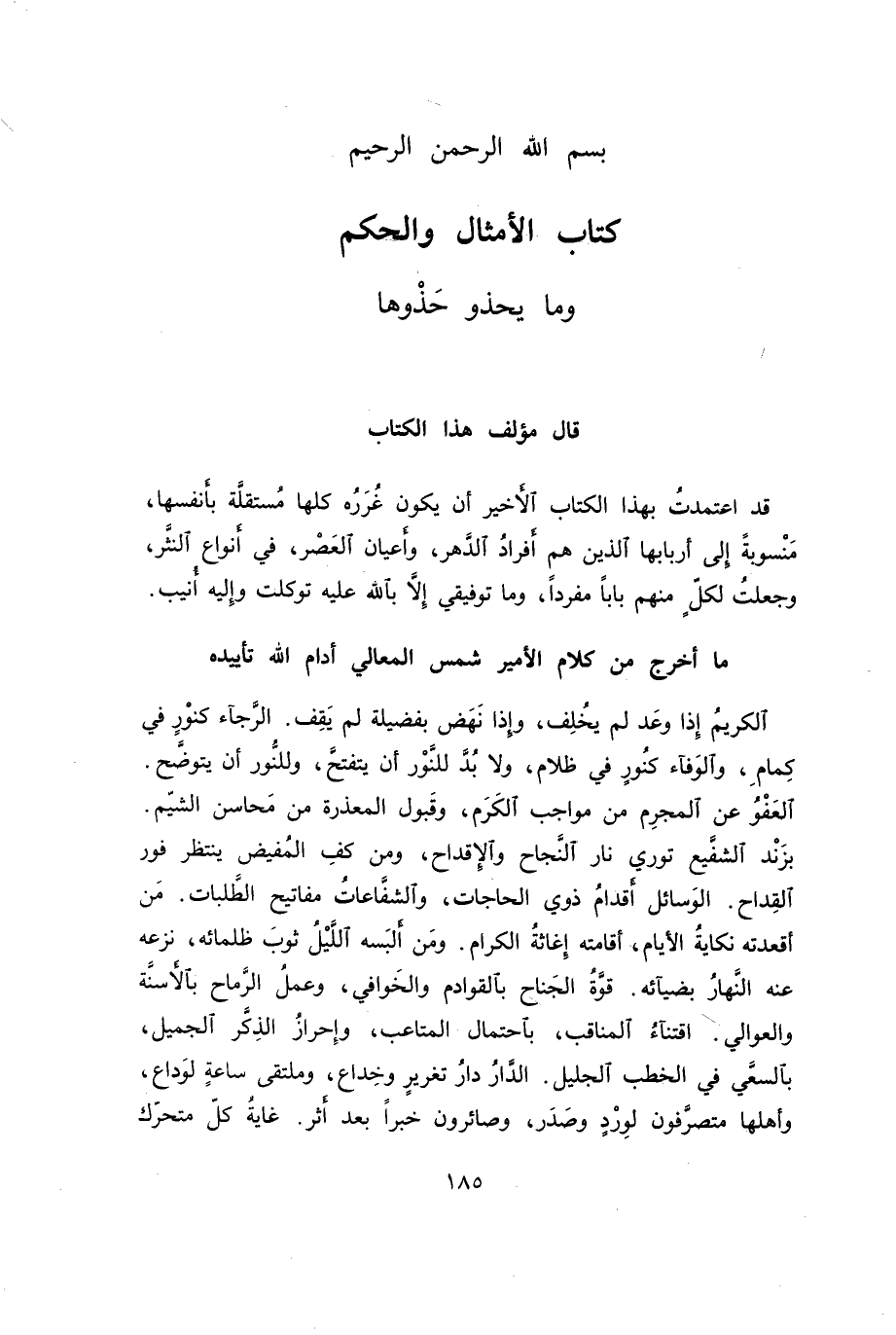قد اعتمدت بهاذ الكتاب الأخير أن يكون غرره كلها مستقلة بأنفسها، منسوبة إلى أربابها الذين هم أفراد الدهر، وأعيان العصر، في أنواع النثر، وجعلت لكل منهم باباً مفرداً، وما توفيقي إلا بالله عليه توكلت وإليه أنيب.