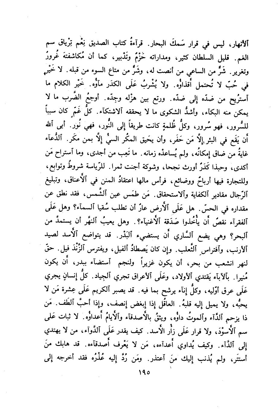 الأنهار، ليس في قرار سمك البحار. قراءة كتاب الصديق نعم ترياق سم الغم. قليل السلطان كثير، ومداراته حزم وتدبير، كما أن مكاشفته غرور وتغرير. شر من الساعي من أنصت له، وشر من متاع السوء قبله. لا خير في حب لا تحتمل أقذاؤه. ولا يشرب على الكدر ماؤه. خير الكلام ما استريح من ضده إلى ضده. ورتع بين هزله وجده. أوجع الضرب ما لا يمكن منه البكاء، وأشد الشكوى ما لا يحققه الاشتكاء. كل غم كان سبباً للسرور، فهو سرور، وكل ظلمة كانت طريقاً إلى النور، فهي نور. أبى الله أن يقع في البئر إلا من حفر، وأن يحيق المكر السيء إلا بمن مكر. الدعاء غاية من ضاق إمكانه، ولم يساعده زمانه. ما تعب من أجدى، وما استراح من أكدى، وحبذا كدر أورث نجحا، وشوكة أجنت ثمرا. للرياسة شروط وتوابع، وللتجارة فيها أرباح ووضائع، فرأس مالها اعتقاد المنن في الأعناق، وتبليغ الرجال مقادير الكفاية