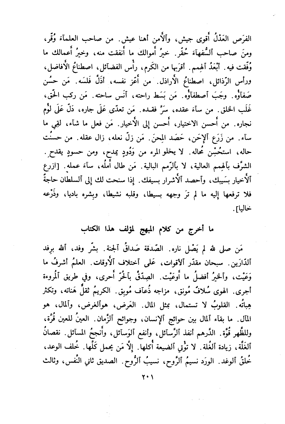 الفرص العدل أقوى جيش، والأمن أهنأ عيش. من صاحب العلماء وقر، ومن صاحب السفهاء حقر. خير أموالك ما أنفقت منه، وخير أعمالك ما وفقت فيه. أبعد الهمم. أقربها من الكرم، رأس الفضائل، اصطناع الأفاضل، ورأس الرذائل، اصطناع الأراذل. من أعز نفسه، أذل فلسه. من حسن صفاؤه. وجب اصطفاؤه. من بسط راحته، أنس ساحته. من ركب الحق، غلب الخلق. من ساء عقده، سر فقده، من تعدى على جاره، دل على لؤم نجاره. من أحسن الاختيار، أحسن إلى الأخيار. من فعل ما شاء، لقي ما ساء. من زرع الإحن، حصد المحن. من زل نعله، زال عقله. م حسنت حاله، استحسن محاله. لا يخلوا المرء من ودود يمدح، ومن حسود يقدح. الشرف بالهمم العالية، لا بالرمم البالية. من طال أمله، ساء عمله. ازرع الأخيار بسيبك، وتحصد الأشرار بسيفك. إذا سنحت لك إلى السلطان حاجة فلا ترفعها إليه ما لم تر وجهه بسيطا، وقلبه نشيطا، وبشره باديا، وذرعه خاليا.