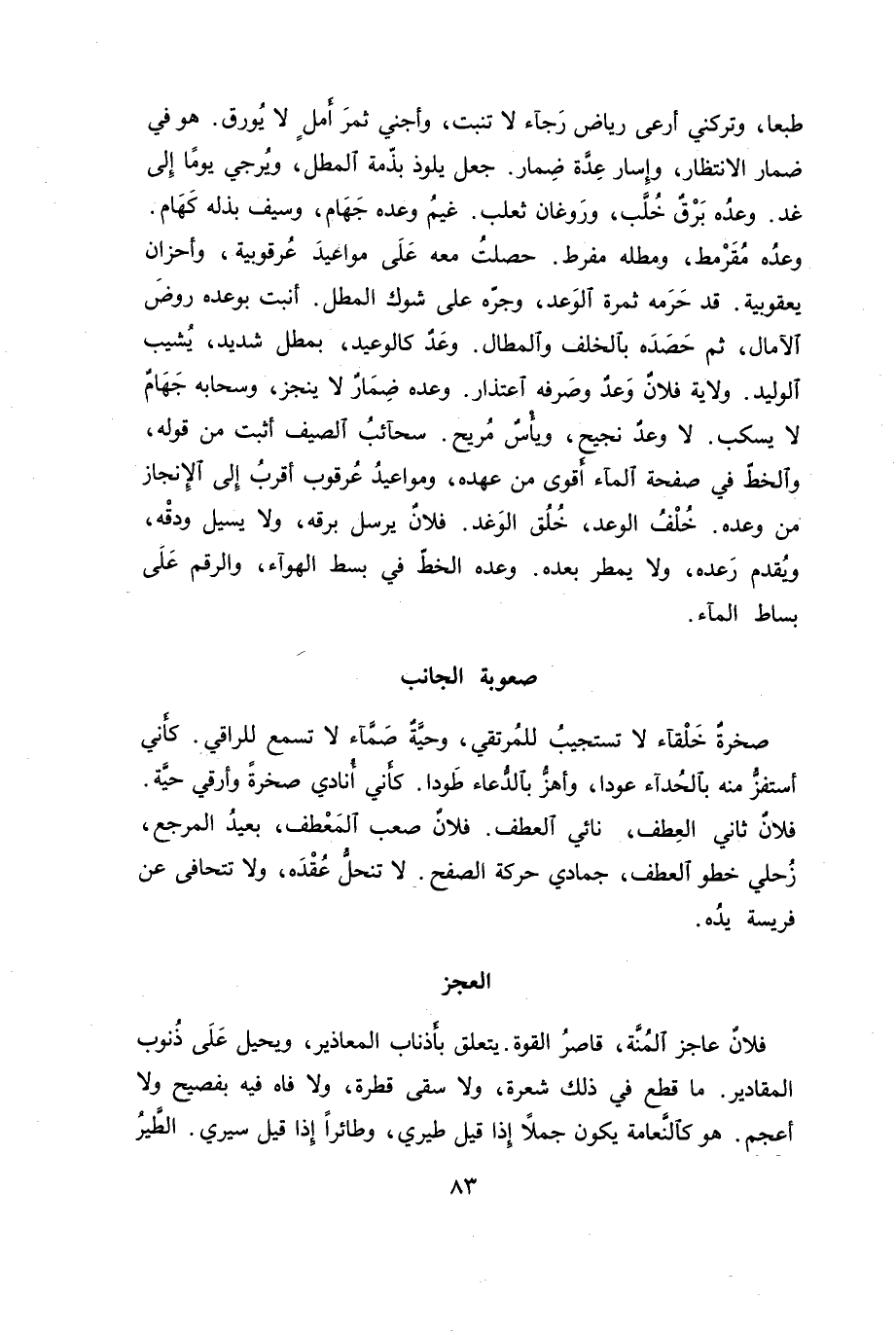 طبعا، وتركني أرعى رياض رجاء لا تنبت، وأجني ثمر أمل لا يورق. هو في ضمار الانتظار، وإسار عدة ضمار. جعل يلوذ بذمة المطل، ويرجي يوماً إلى غد. وعده برق خلب، وروغان ثعلب. غيم وعده جهام، وسيف بذله كهام. وعده مقرمط، ومطله مفرط. حصلت معه على مواعيد عرقوبية، وأحزان يعقوبية. قد حرمه ثمرة الوعد، وجره على شوك المطل. أنبت بوعده روض الآمال، ثم حصده بالخلف والمطال. وعد كالوعيد، بمطل شديد، يشيب الوليد. ولاية فلان وعد وصرفه اعتذار. وعده ضمار لا ينجز، وسحابه جهام لا يسكب. لا وعد نجيح، ويأس مريح. سحائب الصيف أثبت من قوله، والخط في صفحة الماء أقوى من عهده، ومواعيد عرقوب أقرب إلى الإنجاز من وعده. خلف الوعد، خلق الوغد. فلان يرسل برقه، ولا يسيل ودقه، ويقدم رعده، ولا يمطر بعده. وعده الخط في بسط الهواء، والرقم على بساط الماء.