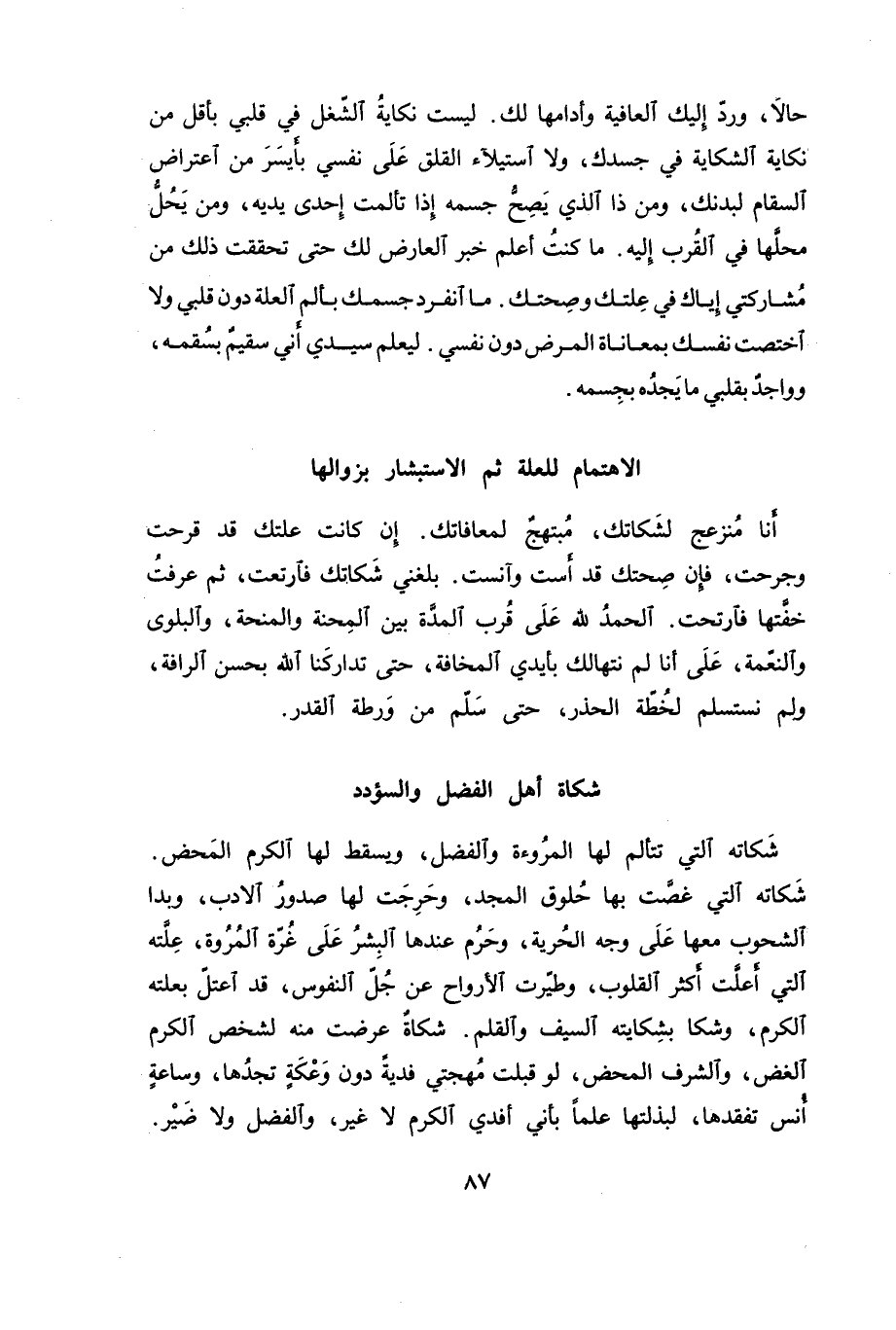 هذه هـ العوارض قد تكون، ثم تزول بإذن الله وتهون. إن الذي يبلغني من ضعفه قد أضعف المنة، وإن لم يضعف الظن بالله والثقة. قد استشف العافية من وراء ثوب رقيق، وبات منها على وعد قريب، ربما يشفى من أشفى، وحسبنا الله وكفى، ما أكثر ما رأينا هذه العلل جلت ثم جلت، وتوالت ثم تولت.