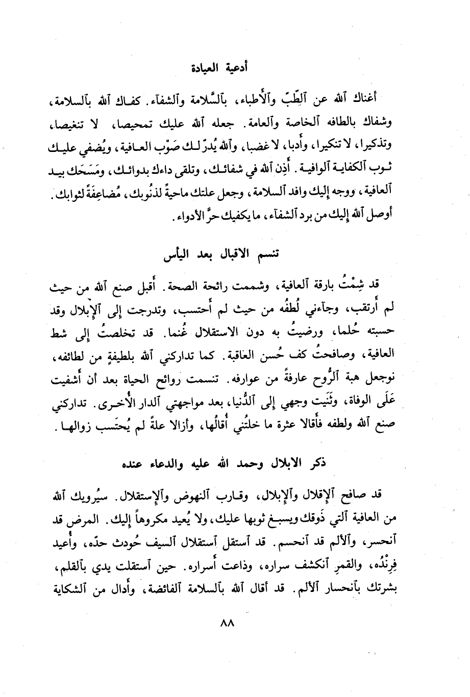 حالاً، ورد إليك العافية وأدامها لك. ليست نكاية الشغل في قلبي بأقل من نكاية الشكاية في جسدك، ولا استيلاء القلق على نفسي بأيسر من اعتراض السقام لبدنك، ومن ذا الذي يصح جسمه إذا تألمت إحدى يديه، ومن يحل محلها في القرب إليه. ما كنت أعلم خبر العارض لك حتى تحققت ذلك من مشاركتي إياك في علتك وصحتك. ما انفرد جسمك بألم العلة دون قلبي ولا اختصت نفسك بمعاناة المرض دون نفسي. ليعلم سيدي أني سقيم بسقمه، وواجد بقلبي ما يجده بجسمه.