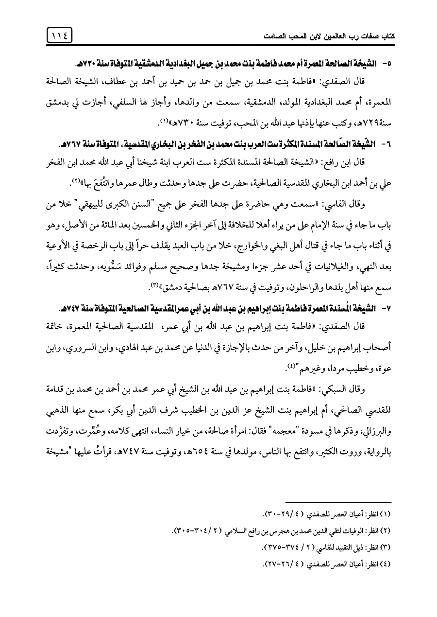 ٥ - الشيخة الصالحة المعمرة أم محمد فاطمة بنت محمد بن جميل البغدادية الدمشقية المتوفاة سنة ٧٣٠ هـ.