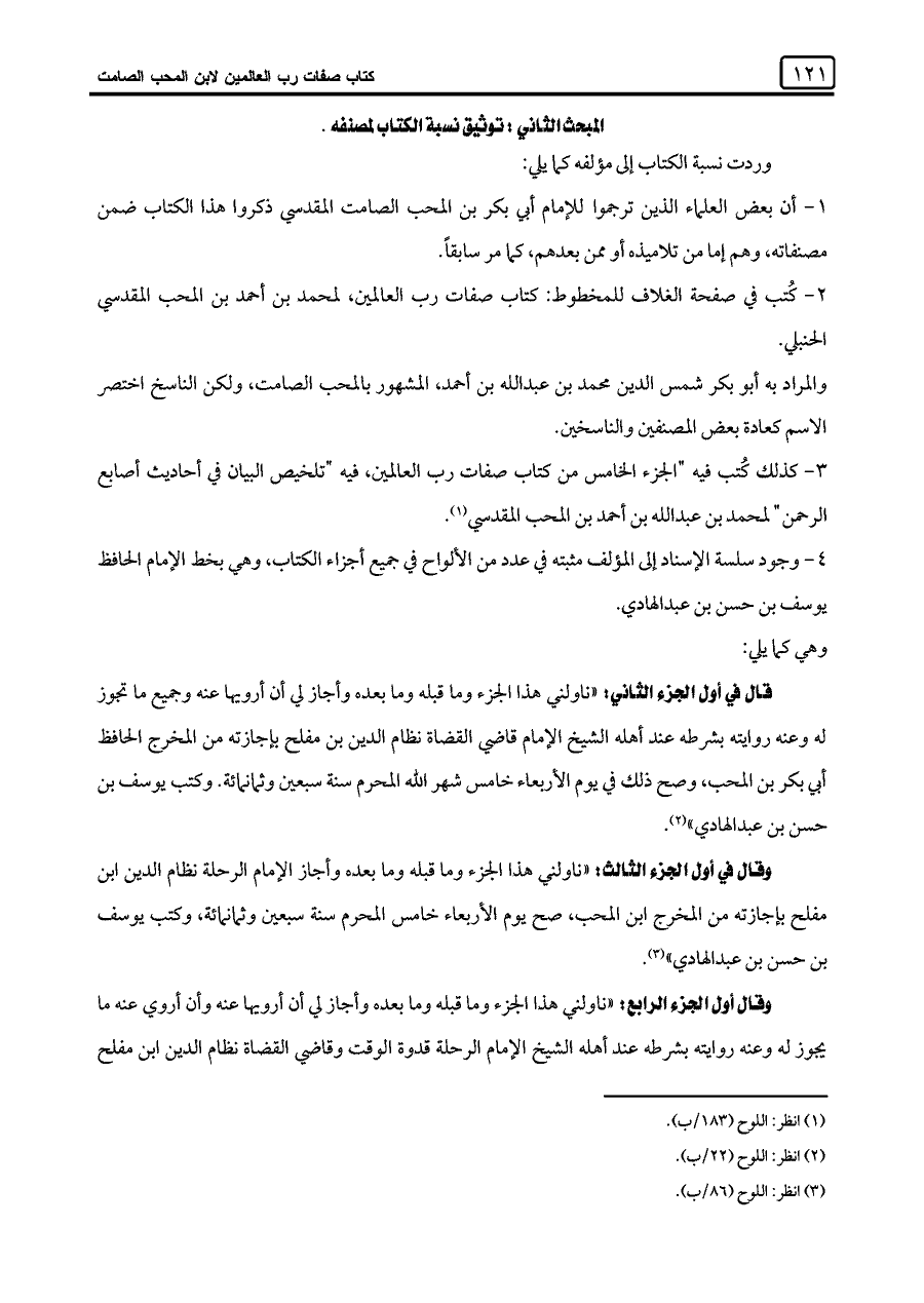 ٢ - كُتب في صفحة الغلاف للمخطوط: كتاب صفات رب العالمين، لمحمد بن أحمد بن المحب المقدسي الحنبلي.