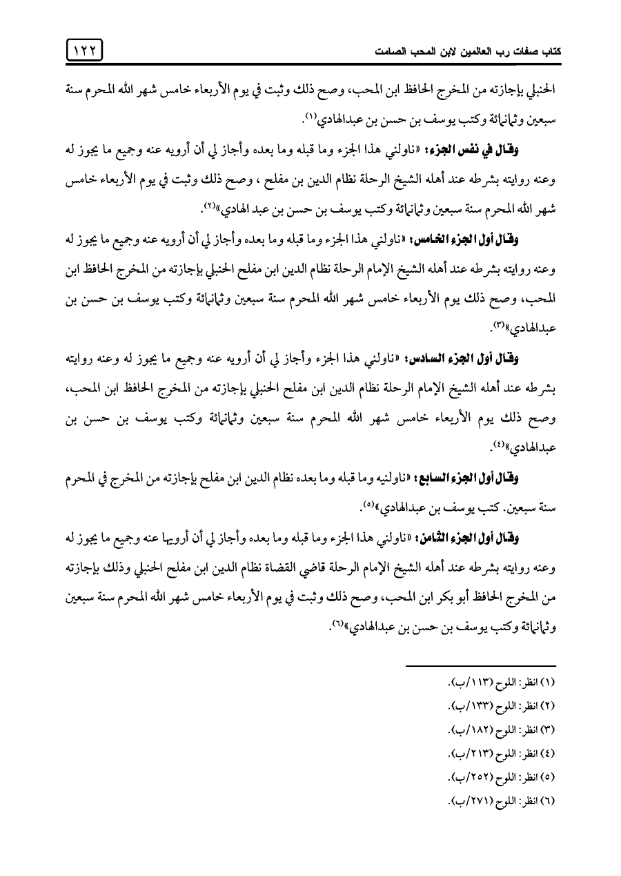وقال أول الجزء السادس: "ناولني هذا الجزء وأجاز لي أن أرويه عنه وجميع ما يجوز له وعنه روايته بشرطه عند أهله الشيخ الإمام الرحلة نظام الدين ابن مفلح الحنبلي بإجازته من المخرج الحافظ ابن المحب، وصح ذلك يوم الأربعاء خامس شهر اللَّه المحرم سنة سبعين وثمانمائة وكتب يوسف بن حسن بن عبد الهادي" (¬٤).