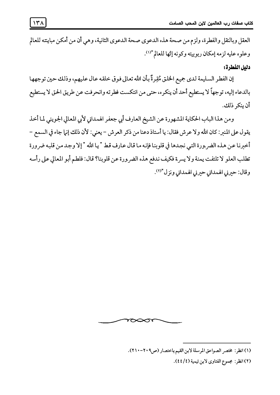 ومن هذا الباب الحكاية المشهورة عن الشيخ العارف أبي جعفر الهمداني لأبي المعالي الجويني لما أخذ يقول على المنبر: كان اللَّه ولا عرش فقال: يا أستاذ دعنا من ذكر العرش -يعني: لأن ذلك إنما جاء في السمع- أخبرنا عن هذه الضرورة التي نجدها في قلوبنا فإنه ما قال عارف قط "يا اللَّه" إلا وجد من قلبه ضرورة تطلب العلو لا تلتفت يمنة ولا يسرة فكيف ندفع هذه الضرورة عن قلوبنا؟ قال: فلطم أبو المعالي على رأسه وقال: حيرني الهمداني حيرني الهمداني ونزل" (¬٢).