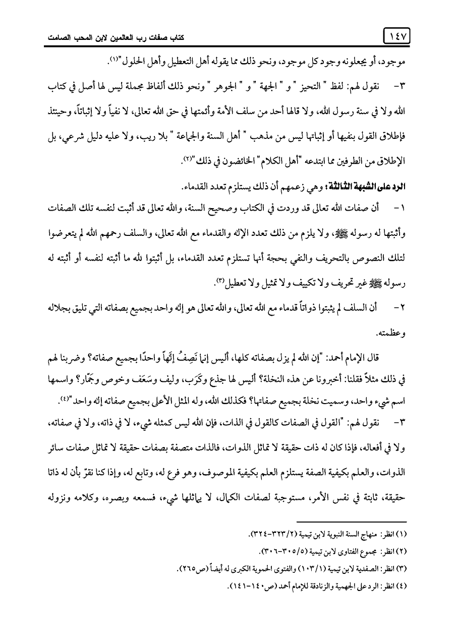 ١ - أن صفات اللَّه تعالى قد وردت في الكتاب وصحيح السنة، واللَّه تعالى قد أثبت لنفسه تلك الصفات وأثبتها له رسوله -صلى اللَّه عليه وسلم-، ولا يلزم من ذلك تعدد الإله والقدماء مع اللَّه تعالى، والسلف رحمهم اللَّه لم يتعرضوا لتلك النصوص بالتحريف والنفي بحجة أنها تستلزم تعدد القدماء، بل أثبتوا للَّه ما أثبته لنفسه أو أثبته له رسوله -صلى اللَّه عليه وسلم- غير تحريف ولا تكييف ولا تمثيل ولا تعطيل (¬٣).